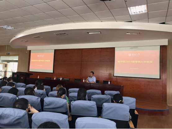 陈涛副院长对全体2019级专业硕士新生提出三点希望:一是合理规划时间,协调好学业、家庭和工作的关系,坚持不懈,完成学业;二是明确学业目标,找准研究方向,厚积薄发;三是厚德载物,德才兼备,争做有思想、有道德、有文化的人。