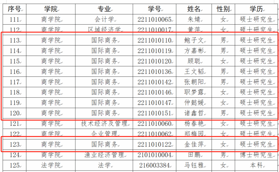 此次荣获省级优秀毕业生称号的是 2022 级鲍子文、方嘉彬同学。校级优秀毕业生则包括鲍子文、方嘉彬、顾聪、王文韬、张朝阳、职梦露、仲懿媛、诸鑫哲、金佳萍等九名学子。值得关注的是,这九名同学在毕业之际已顺利开启人生新征程:有的成功考取知名高校博士研究生,将在学术领域继续深耕;有的通过公务员考试进入重要党政机关,投身公共服务事业;还有同学入职行业头部机构,在国际商务相关岗位上施展专业所长。