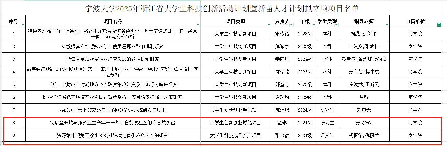 3月7日,2025年浙江省大学生科技创新活动计划暨新苗人才计划立项结果正式公布。24级国际商务专业研究生张金蓓、湛琳同学作为项目负责人,其项目在大学生科技创新项目中成功立项,展现了我院学子在学术研究方面的强劲实力与创新精神。特此祝贺!