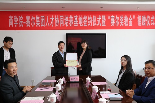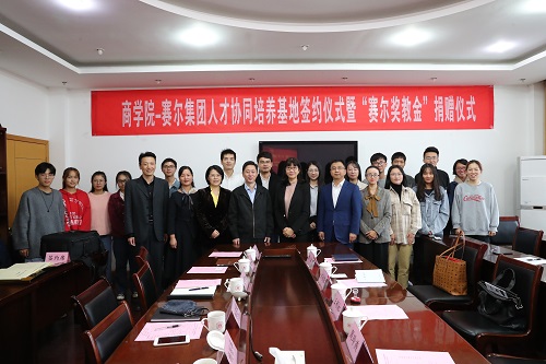 会上,赛尔集团副总裁王彩虹和我院党委书记史宏协签订了“赛尔奖教金”捐赠仪式,集团每年捐赠伍万元用于奖励 “最美商院人”。赛尔集团副总裁方永强和我院党委副书记韩雯琛签订了“人才协同培养基地合作协议”,双方约定资源共享,优势互补,共同为“未来商界精英”的培养目标而努力。
