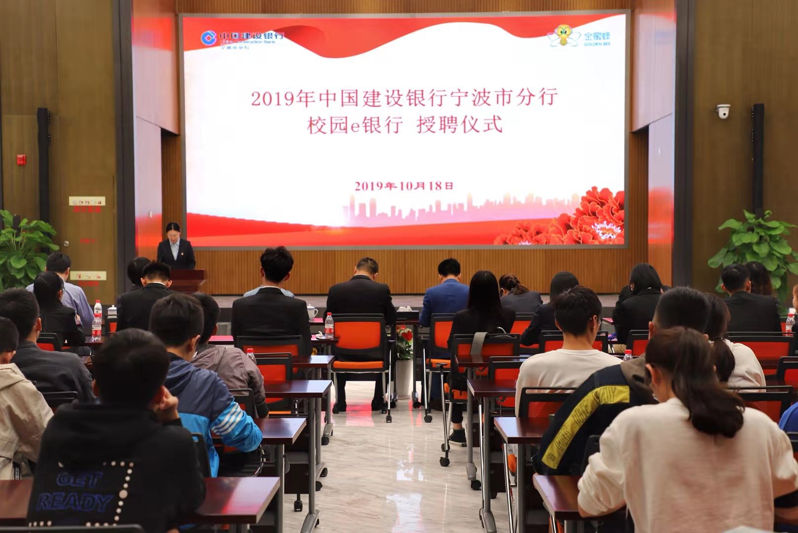 10月18日下午,建设银行宁波市分行校园e银行授聘仪式在中国建设银行宁波分行371多功能厅圆满落幕,本次仪式在上一届成功经验的基础上,沿用了授聘仪式与金融宣讲相结合的形式。中国建设银行宁波市分行韩国辉副行长,17吃瓜网 党委书记史宏协、协理副院长朱一鸿、团委副书记章舒怡,浙江万里学院党委副书记王伟忠、学工部部长林德操、团委副书记吴章健等领导和嘉宾出席本次授聘仪式。