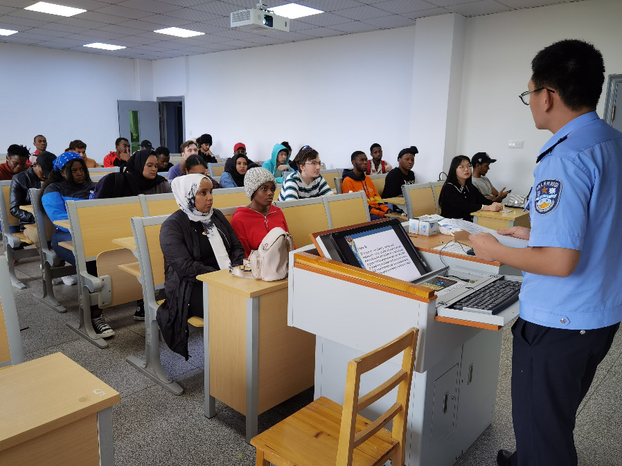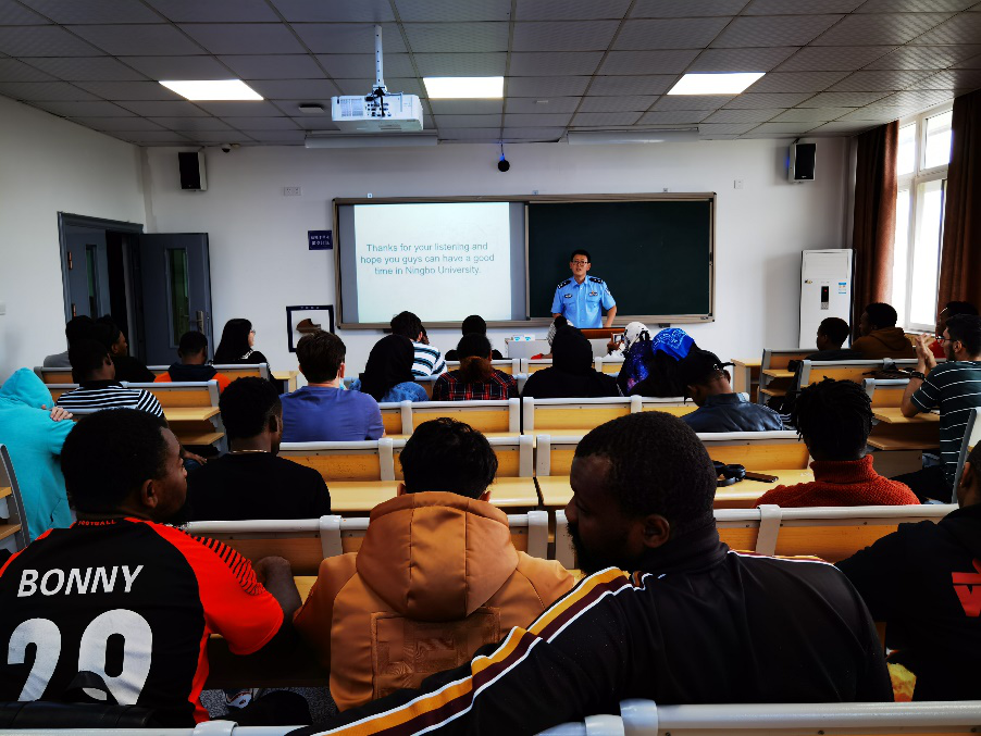 9月23日,留学生治安案例宣讲会在8号楼305教室举行,宁波市中马派出所民警王永辉来到17吃瓜网 为留学生现身说法。王警官以案说法,以案示规,用大量生动丰富的治安案例教育警示学生,让学生们受益匪浅,吸引了很多留学生来现场交流。