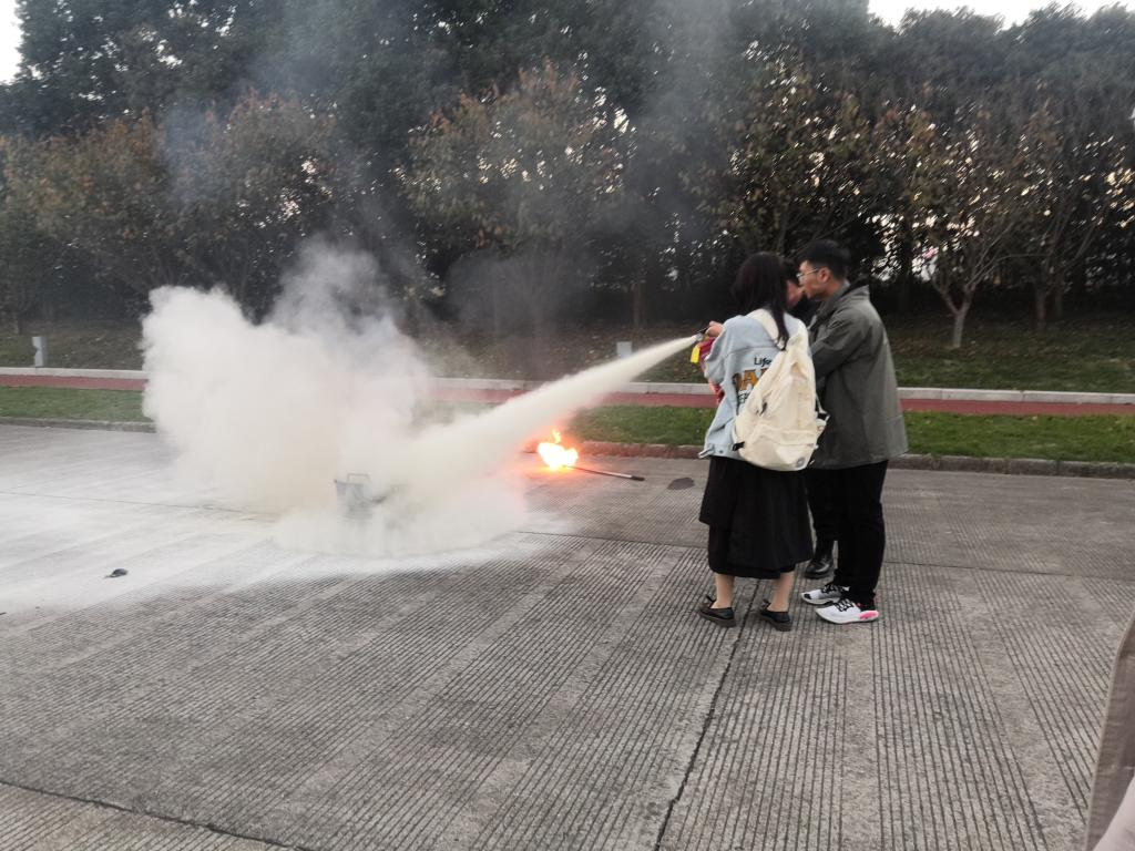 活动伊始,徐作义为在场同学科普了消防安全知识,传授了防火救火技能。其中,他重点讲解了灭火器的构造、使用方法、操作步骤等内容。随后,进入消防演习模拟环节,演习安排在11号楼楼下空旷场地,现场准备了柴油桶、柴油等道具,学生亲身体验了灭火器的使用。