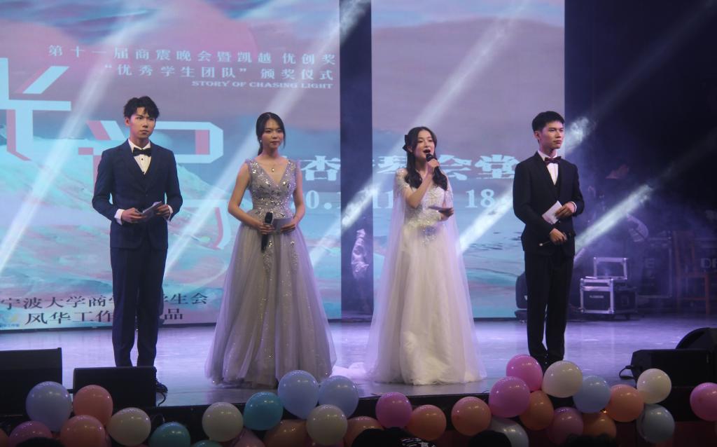 2020年11月29日晚上,我院“凯越.优创奖”颁奖仪式暨“追光记”商·震主题晚会于林杏琴会堂成功举办。宁波凯越国贸集团董事总经理朱吉、学院党委副书记韩雯琛、各兄弟学院团委书记、学院各系教师和各行政办公室老师、学院全体辅导员以及我院学生共800余人观看了整场晚会。