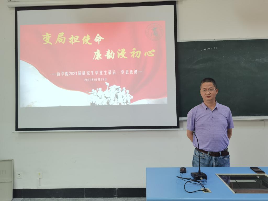 初秋相遇,盛夏离别,6月23日下午我院于叶耀珍楼202教室举办了“廉韵浸初心,变局担使命”2021届研究生毕业生最后一堂思政课活动,我院纪委委员朱福建受邀出席,2021届研究生毕业生参与。本次活动由我院研究生辅导员朱文洁主持。