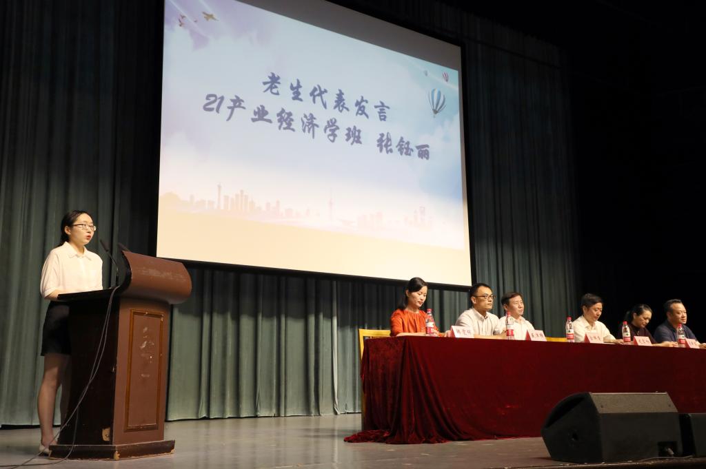 17级经济学专业的张钰丽作为老生代表发言,她告诫学弟学妹们在大学学习中,首先要认识自身、设立大目标,其次需学会合理安排时间,最后还要注重品德培养,热心公益。接着,陆智强代表全体新生班主任,提出了对我院新生的诸多期望,希望同学们担少年之责,抱爱国之怀,做求是创新的商院人,立大志而成大器。