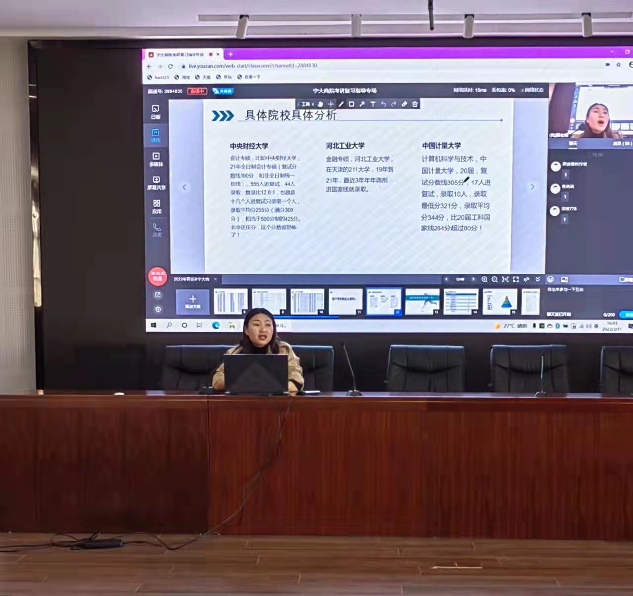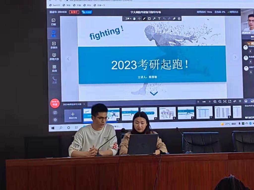 3月11日,我院考研复习指导讲座以线上直播与线下讲座相结合的方式成功举办。讲座由17吃瓜网 辅导员龚昆朋主持,海文考研讲师顾慧敏和60余名学生参加。