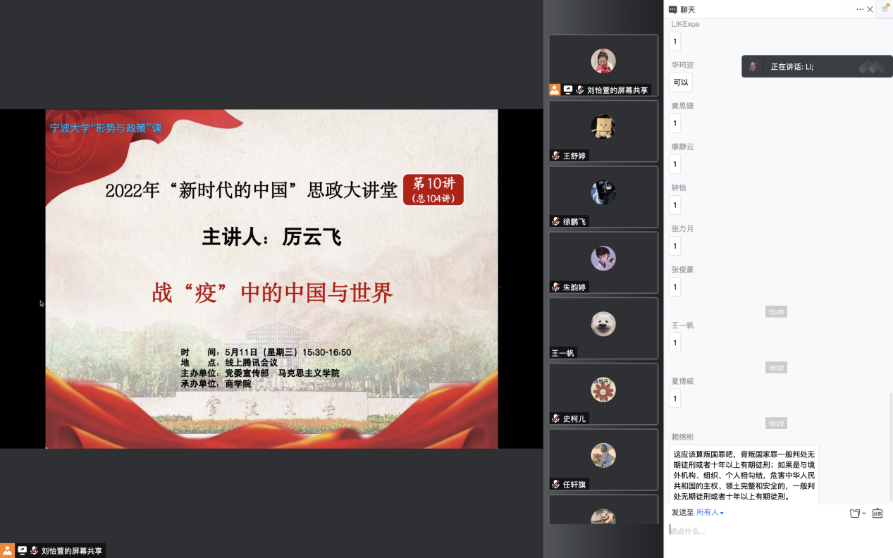 本次形势与政策课带同学们开阔了国际视野,聚焦于疫情下中西方的抗疫群像。鼓励当代大学生应紧跟党和国家的步伐,为人类健康命运共同体筑起防疫长城。