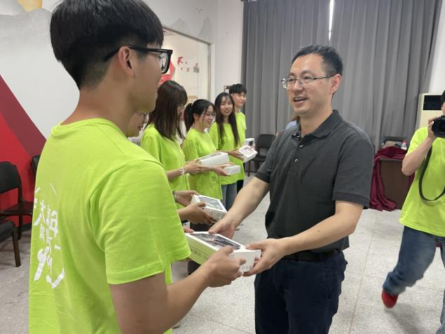 童晓晖书记在发言后向我院社会实践的同学们发放了纪念品,并和同学们一起合影留念。