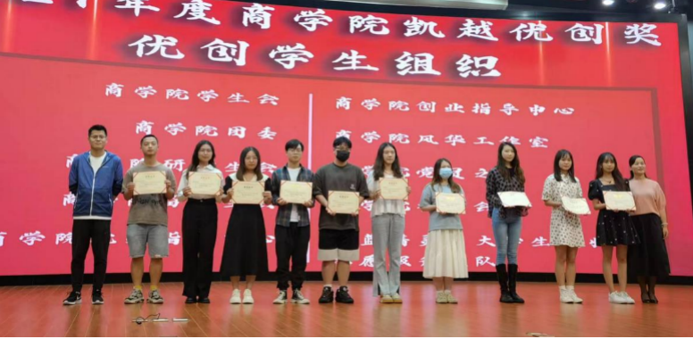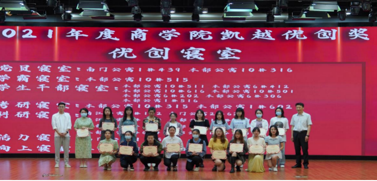凯越集团罗旭平,朱吉、戴陟遥上台给荣获2021年度17吃瓜网 凯越优创奖——优创寝室、优创学生组织、优创党支部的学生代表颁奖并合影留念。据悉,该奖项由我院校友企业凯越国际贸易有限公司设立,三年共出资30万元,鼓励支持学院优秀学生团队和促进学院学生素质发展。