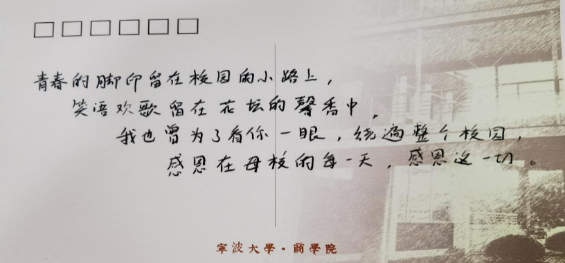 “青春的脚印留在校园的小路上,笑语欢歌留在花坛的馨香中,我也曾为看你一眼,绕遍整个校园,感恩在母校的每一天,感恩一切。”2022届我院金融专业的研究生在明信片上留下的活动感言。