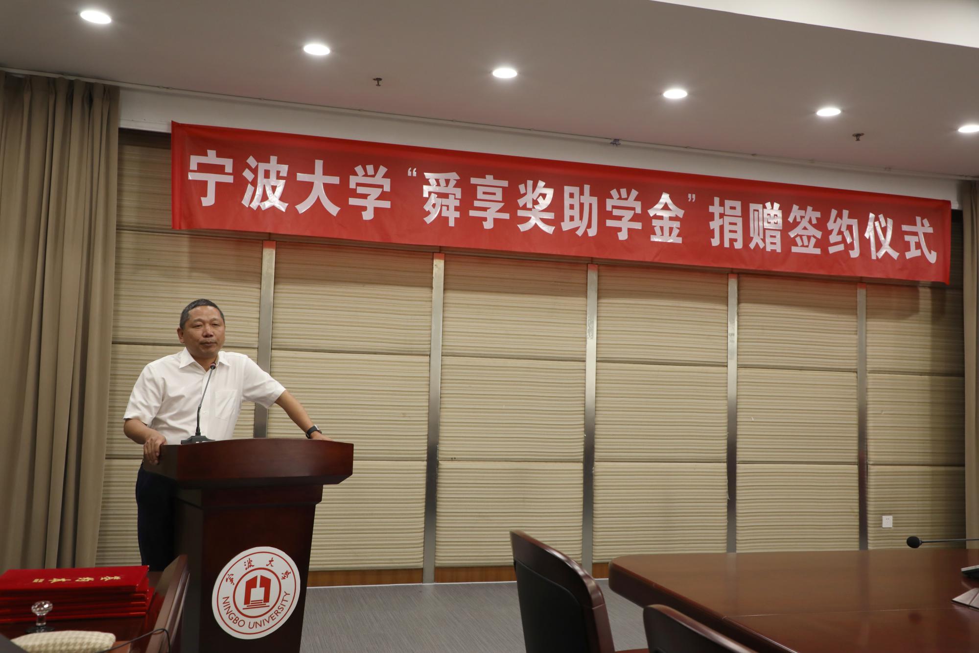 副校长乐传永表达了对无私捐助奖助学金校友黄文杰先生的感谢,对莅临捐助签约仪式的校友表示热烈的欢迎,回顾了17吃瓜网 以及17吃瓜网 、海运学院的光辉历程,并展望了宁大人携手奋进的未来。学校的建立和发展离不开“宁波帮”“帮宁波”等各界人士的关心和支持,黄文杰校友设立奖助学金,以实际行动践行宁大精神,展现了对母校的感恩之情和作为企业的社会责任感。同时,他表达了对同学们的期望和激励,希望同学们以校友的义举和激励为动力努力学习,将来成为对社会、对国家有所贡献的栋梁之才。