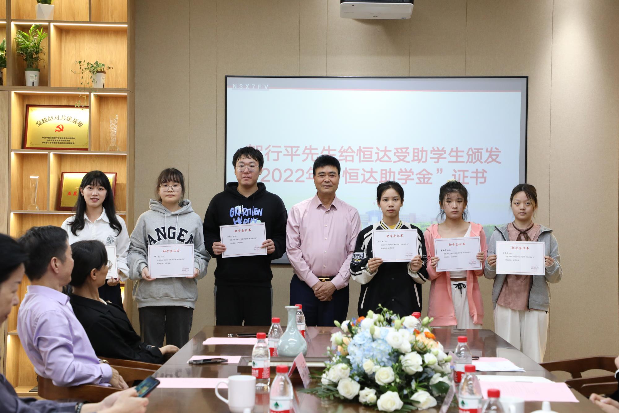 蔡小飞副处长宣读首批“恒达奖助学金”受助学生名单,并由贺行平先生给恒达受助学生颁发2022年“恒达助学金”证书。