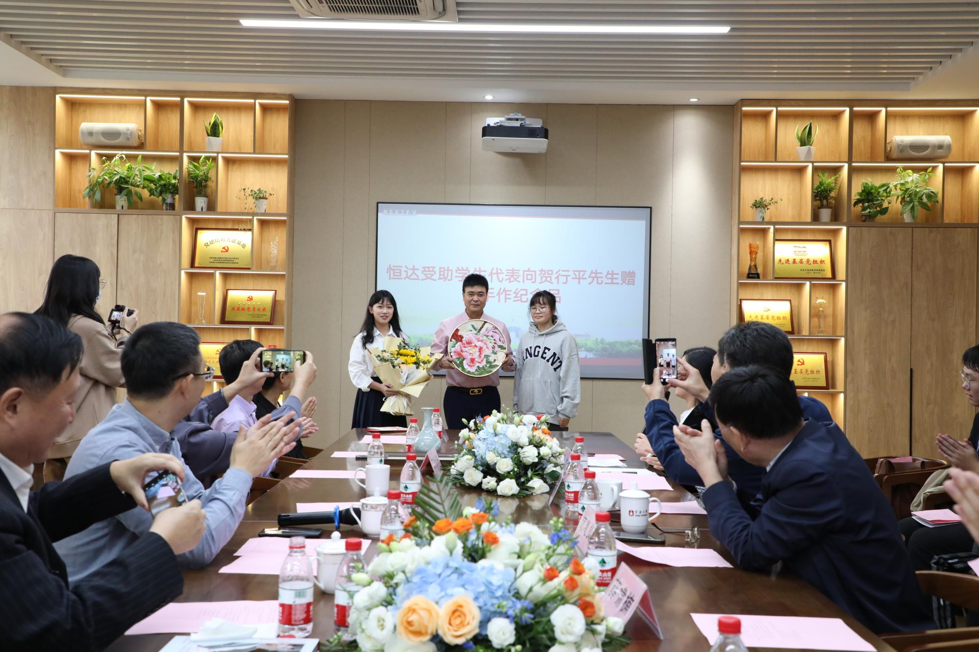 恒达受助学生代表向贺行平先生赠送手作纪念品——一幅由“恒达学子”共同制作的掐丝珐琅牡丹图。牡丹代表着学子们的丹心赤忱,表达了他们将铭记贺行平先生的无私奉献,象征着祥瑞与长寿的珐琅则承载着学子们对贺行平先生生活幸福美满、平安康健的美好祝福。