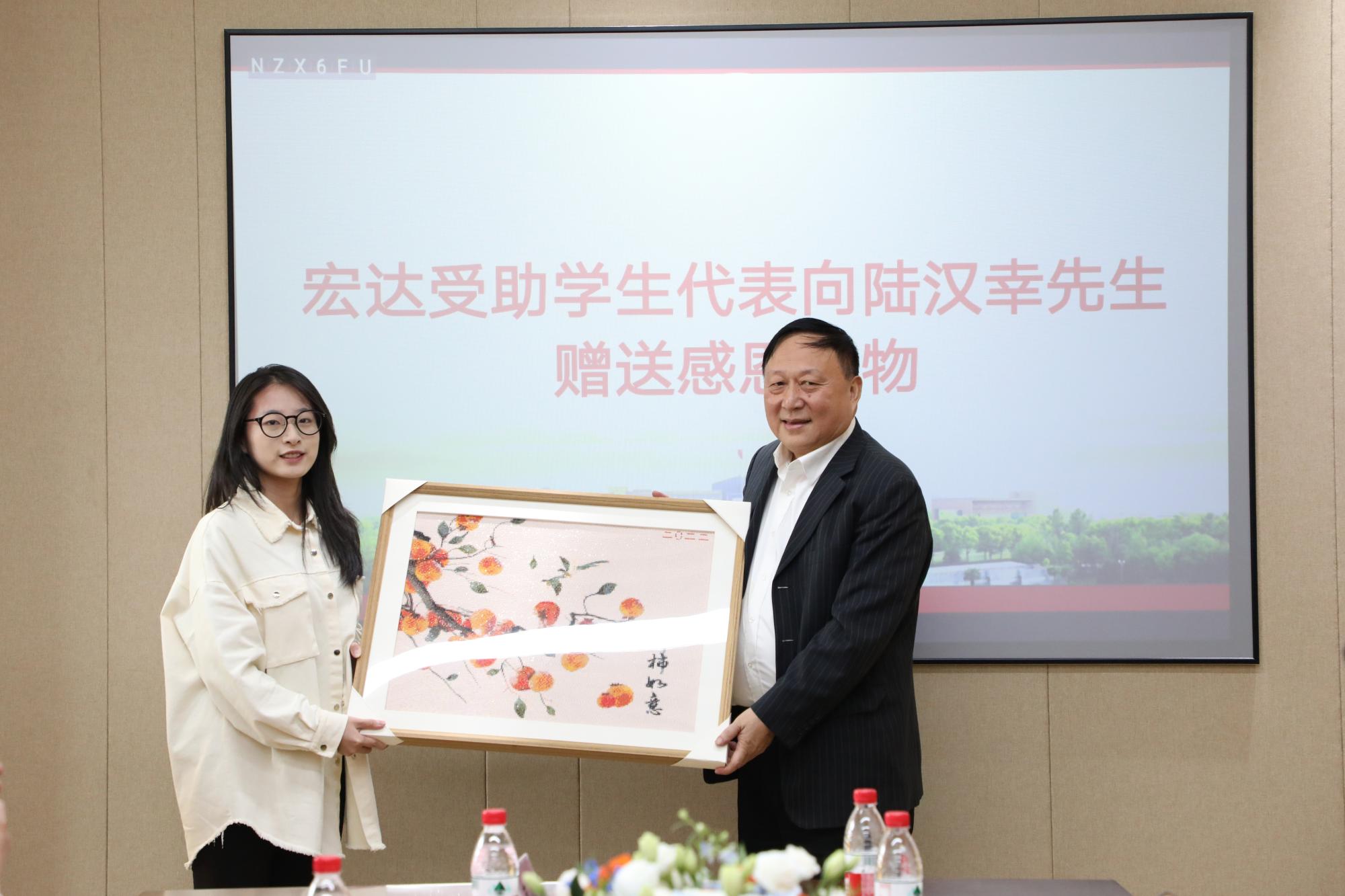 宏达受助学生代表向陆汉幸先生赠送感恩礼物——一幅由所有宏达学子用DTY碎钻贴成的“柿柿如意”图。图中上万颗碎钻如同熠熠星光汇集的星河,表达了同学们对陆汉幸先生的感激之情。