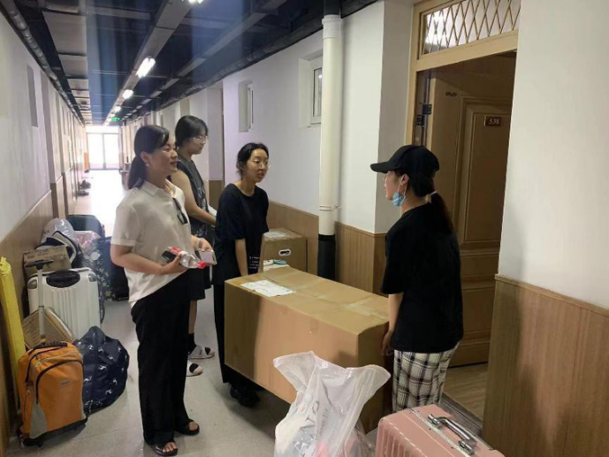 搬迁过程中,我院党委副书记韩雯琛带领辅导员老师来到宿舍楼中,帮助大家解决搬迁过程中所遇到的问题,并提醒同学们做好个人物品的整理。