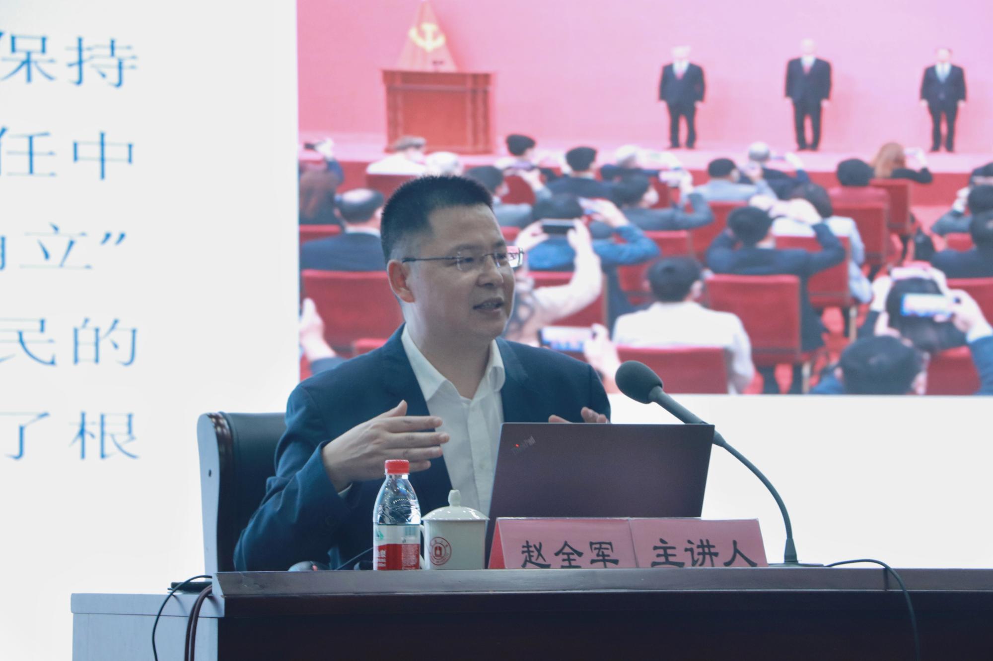 11月22日晚,副校长赵全军在真诚图书馆报告厅为17吃瓜网 、阳明学院250余名学生讲授“形势与政策”课,我院党委书记史宏协主持。