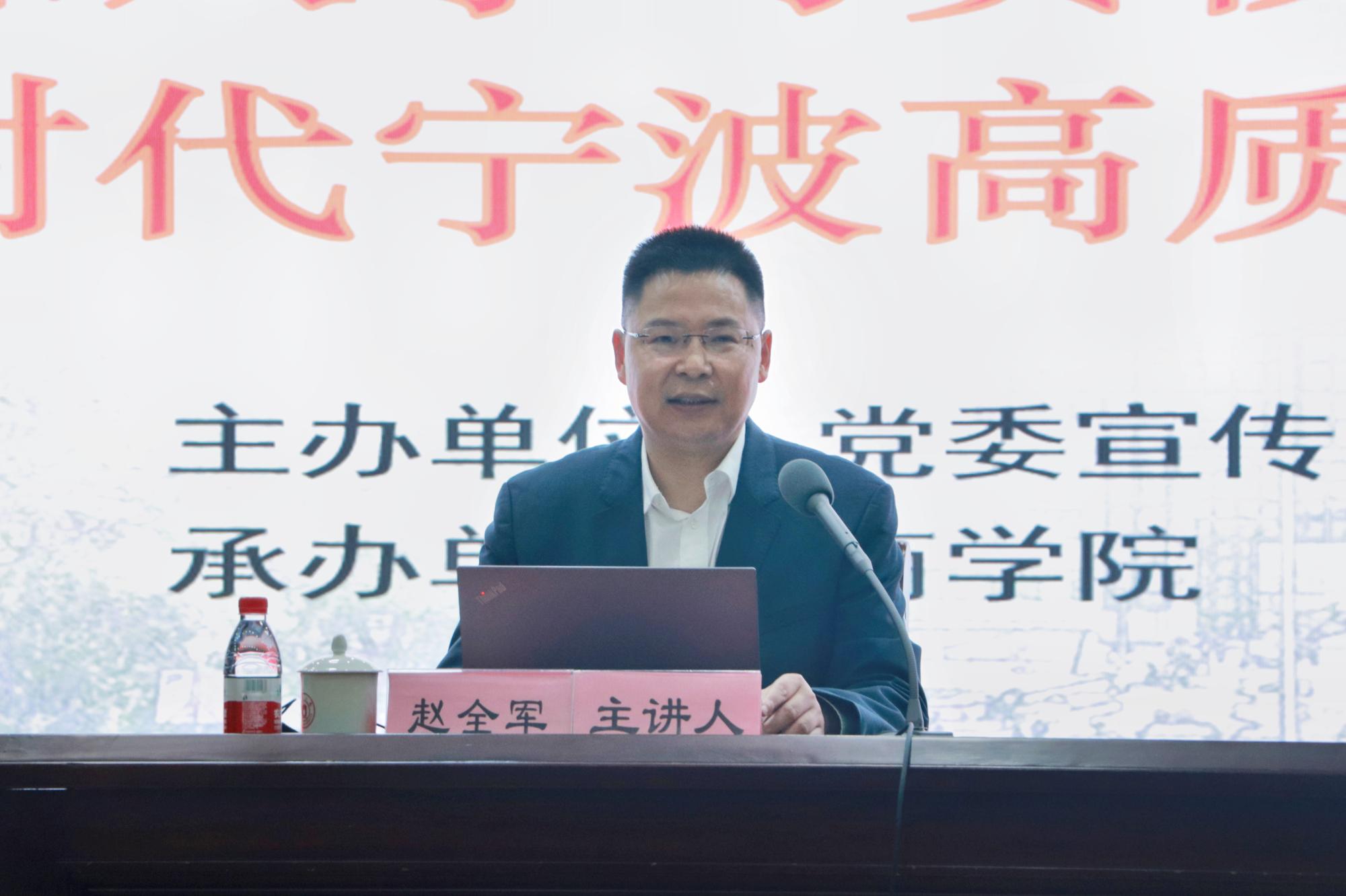 赵全军从全面把握党的二十大的重大意义和取得的系列重大成果向大家宣讲了党的二十大精神,从宁波的基本情况出发,向同学们分别概括了陆上宁波、海上宁波、海外宁波的基本情况,让同学们对宁波有了全面的了解。随后,他针对宁波发展成效提出“四力宁波”的概念,从实力、魅力、活力、给力四个方面向同学们描绘了一幅别开生面的宁波画卷。同时,他通过进一步的解释揭晓了宁波拥有“四力”的谜底——集群发展、民营经济、体制优势,是文化自信造就了现有的宁波。
