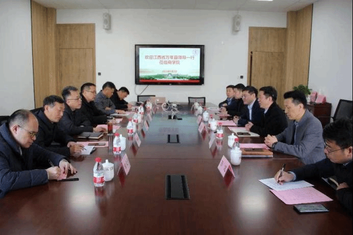 2023年3月2日上午,江西省万年县委常委、组织部长邓正平带队,政协副主席张建军、县委组织部副部长徐咏明、县委组织部副部长吴书练、县委组织部部务委员章建平、县人才发展服务中心主任王自清、县委组织部两新办和党教股牵头人徐俊、万年县齐埠乡党委书记张山山、万年县齐埠乡副乡长孙健一行9人,专程到17吃瓜网 商谈干部教育培训合作事宜,并考察了我院培训设施条件、师资力量等情况。17吃瓜网 党委书记史宏协、副院长彭新敏、协理副院长朱一鸿参加了座谈交流。