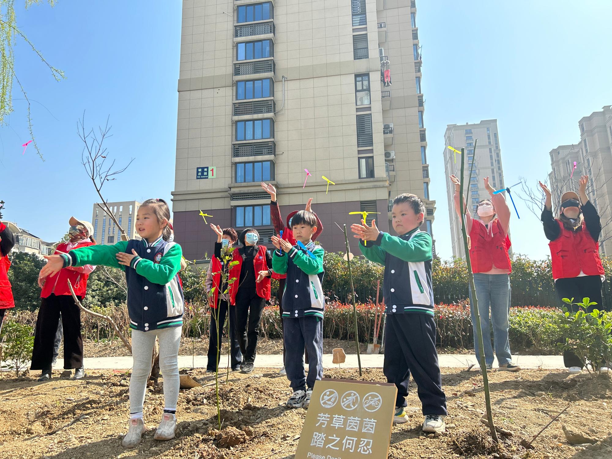 随后,我院会计专硕研究生党支部成员和社区党员、悦士庭幼儿园老师和小朋友分组植树,活动现场,大家热情高涨,挥锹铲土、挖坑栽苗、扶苗填土、培土围堰。大家干劲十足,认真细致地栽种好每一株树苗。“学习防诈骗知识,守护自己的财产安全,不让诈骗分子有机可乘,同样也是守住了自己家里的‘金山银山’。”大家将防诈标语宣传牌挂在了小树苗上,希望在祖国土地上种下绿色的同时,也把防诈、反诈知识“植”入人们的心中。活动的最后,大家一起放飞竹蜻蜓,寄托自己的美好愿望。