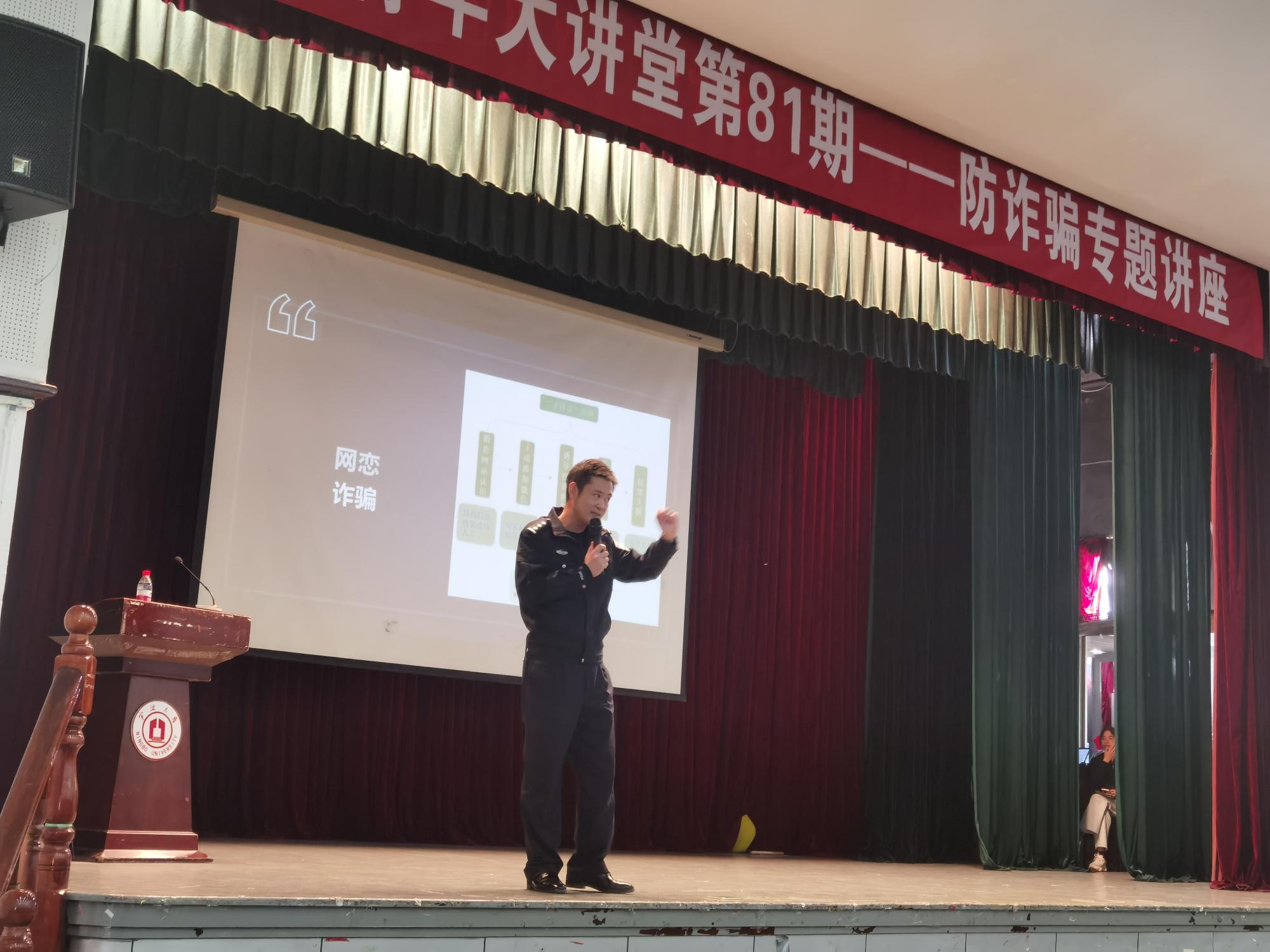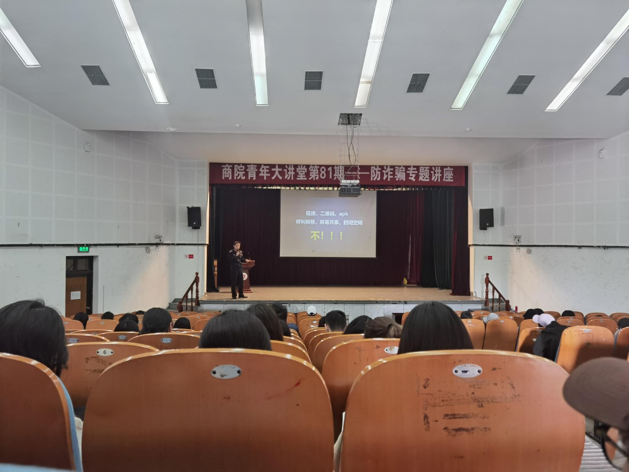 4月12日,我院于锦绣小剧场开展商院青年大讲堂第81期防诈专题讲座,本次活动由庄市派出所杨延飞警官主讲,我院二百余名学生参加本次活动。