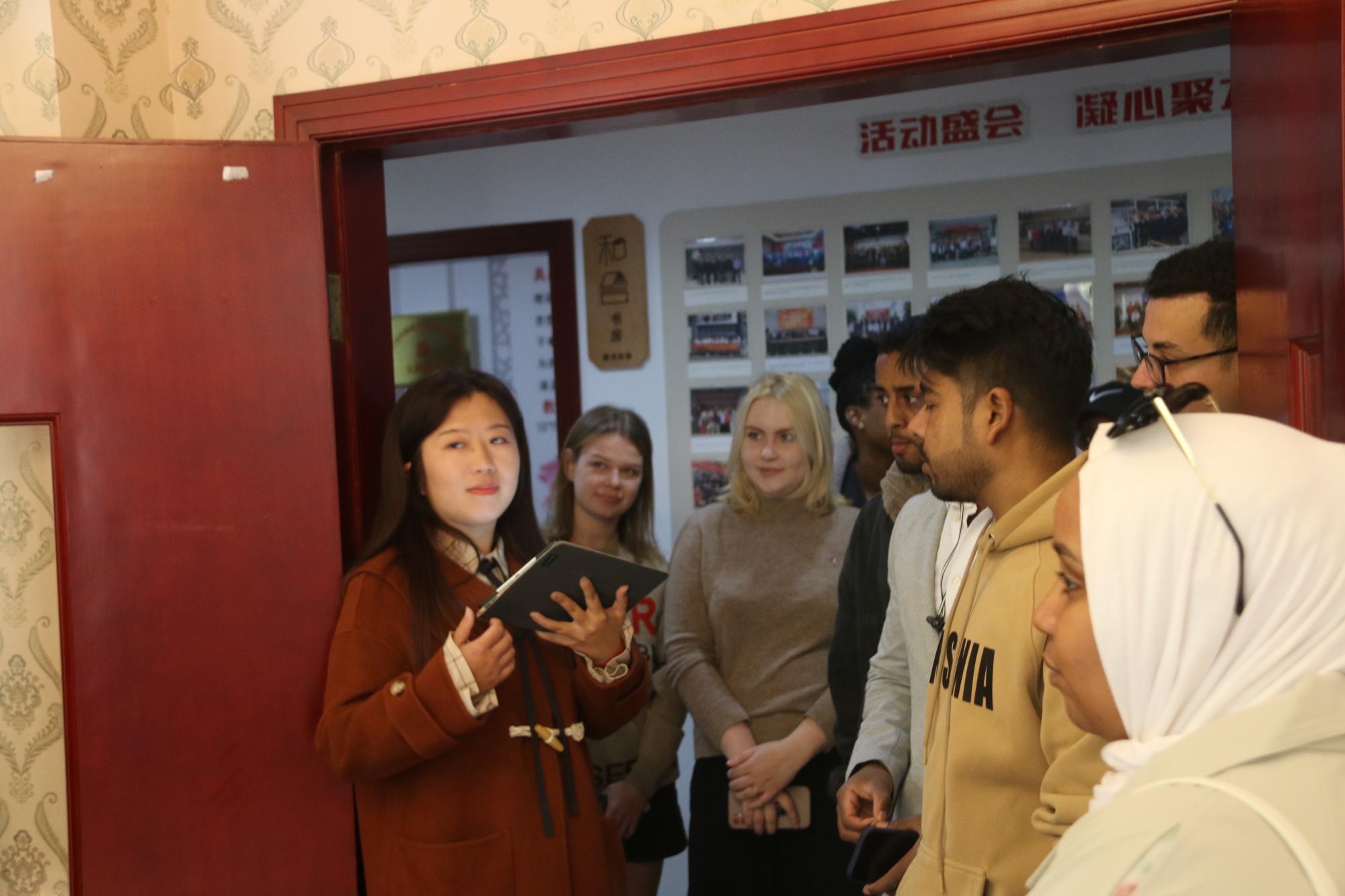 在工作人员的热情引导下,一行人参观展品区,飓鹏公司董事长助理黎莹向留学生们介绍公司的主要产品,并且向同学们展示了安全鞋的制作过程,让同学们对公司的主营商品类目有所了解。