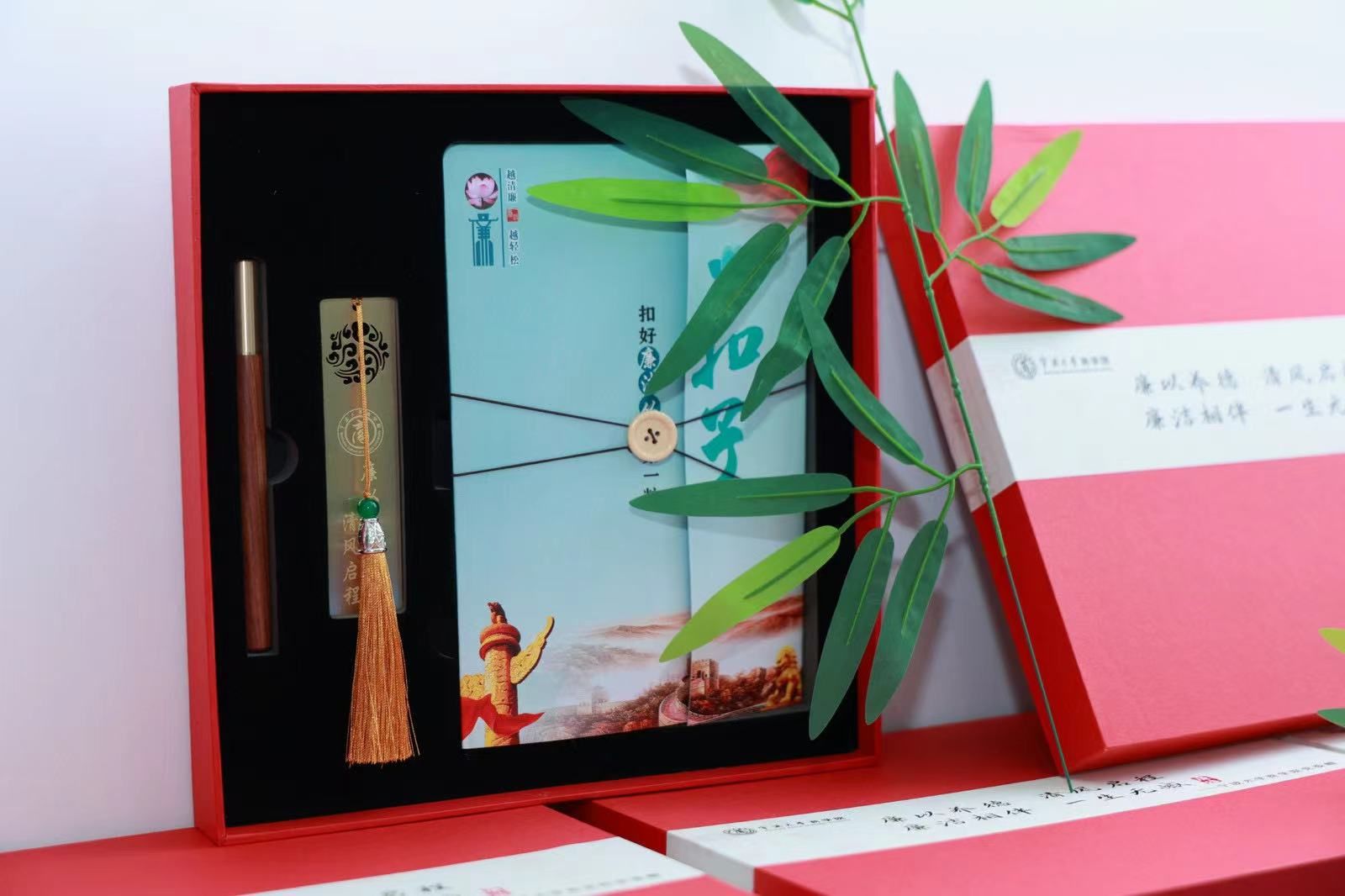 廉洁戒尺书签、檀木笔、扣好廉洁从业第一粒扣子书套以及教师手写的廉洁寄语书签......同学们说收到今天这么别致的礼物很惊喜。