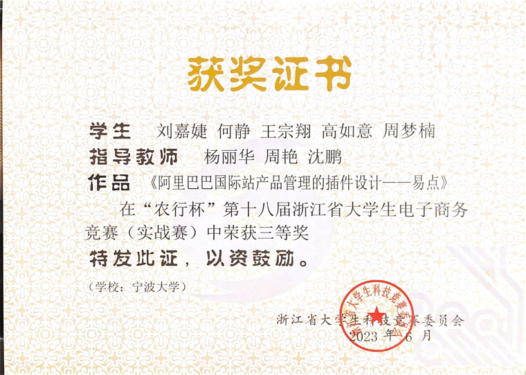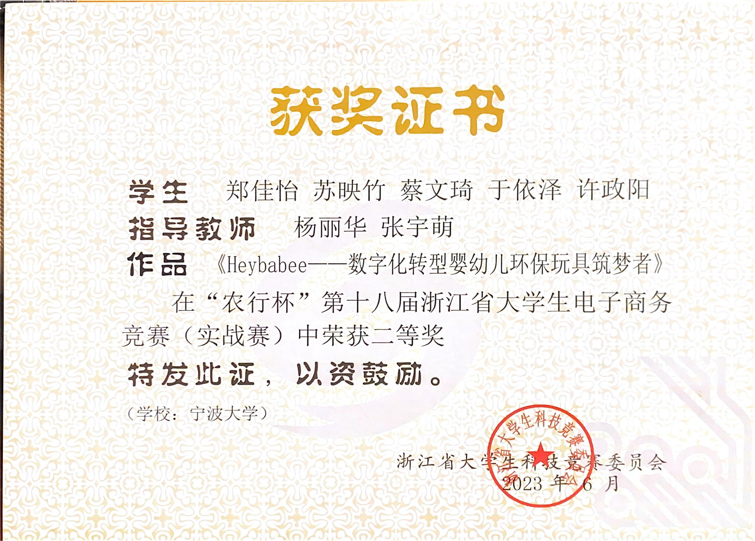 5月28日,“农行杯”第十八届浙江省大学生电子商务竞赛暨第十三届全国大学生电子商务“创新、创意及创业”挑战赛浙江省选拔赛落下帷幕。17吃瓜网 跨境电商微专业由杨丽华、张宇萌老师指导,郑佳怡、苏映竹、蔡文琦、于依泽、许政阳同学参与的作品《Heybabee——数字化转型婴幼儿环保玩具筑梦者》荣获跨境电商—阿里巴巴国际站赛二等奖;由杨丽华、周艳、沈鹏老师指导,刘嘉婕、何静、王宗翔、高如意、周梦楠同学参与完成的《阿里巴巴国际站产品管理的插件设计——易点》获得跨境电商—阿里巴巴国际站赛三等奖。这也是跨境电商微专业学生继首届“典阅杯”全国高校跨境电子商务综合能力大赛全国总决赛斩获佳绩后,第二次在该项赛事中获奖。