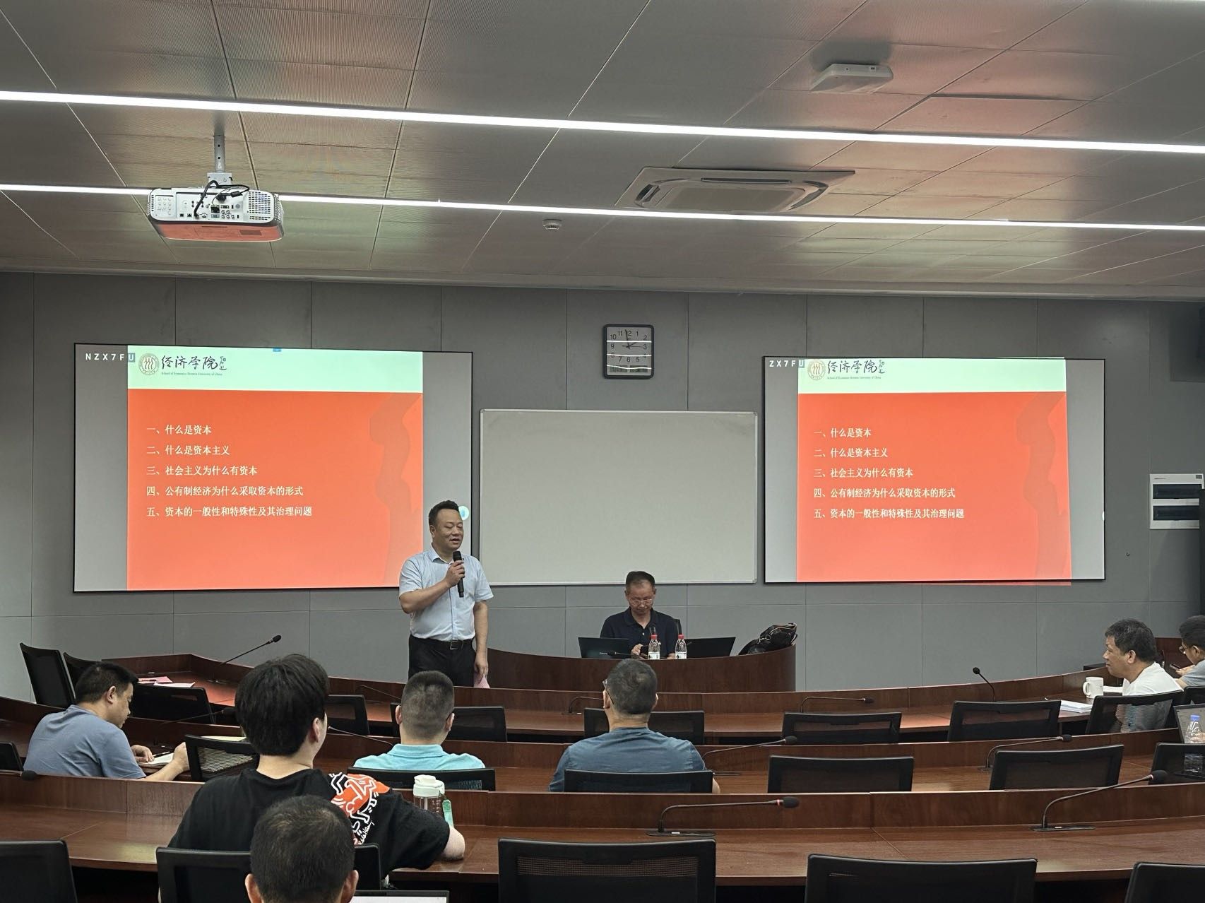 本次研修班主要由两个部分组成,第一部分为中国人民大学经济学院邱海平教授开展主题为“关于社会主义市场经济条件下的资本问题”的学术报告。在17吃瓜网 陈涛副院长的主持下,邱教授从习近平新时代中国特色社会主义理论出发,讲述在中国社会环境下的资本与资本主义的基本定义,以及资本主义存在的一定合理性,深入分析当前我国公有制经济采取资本形式的原因,并对资本主义在中国特色社会主义道路下的治理问题提出自己的独到见解。