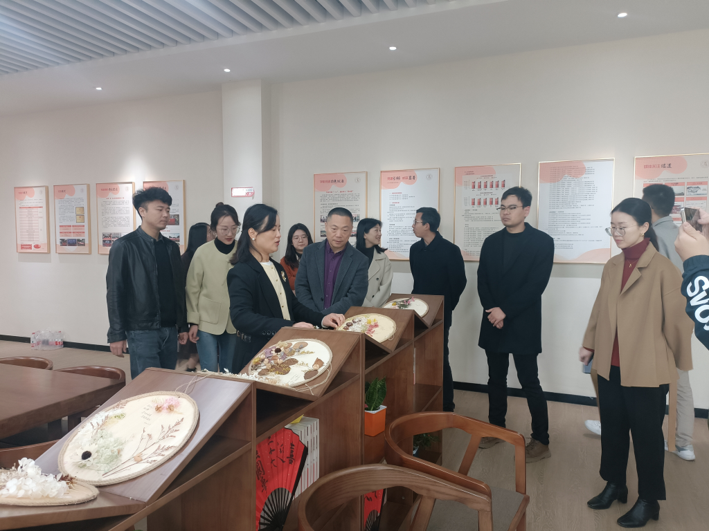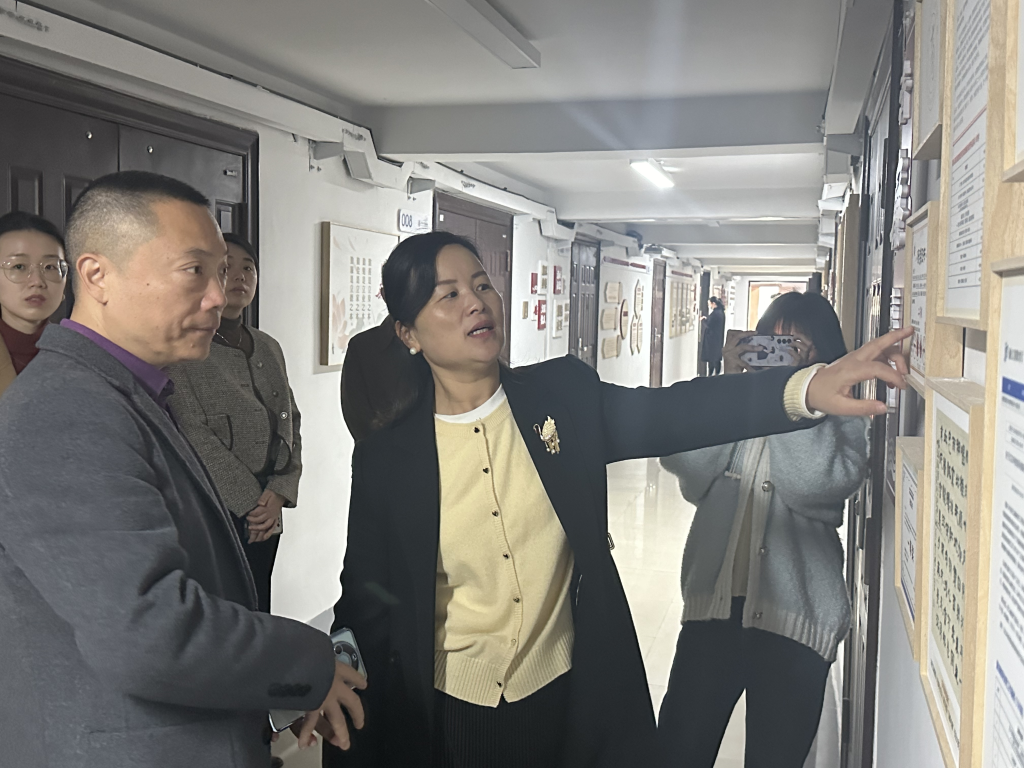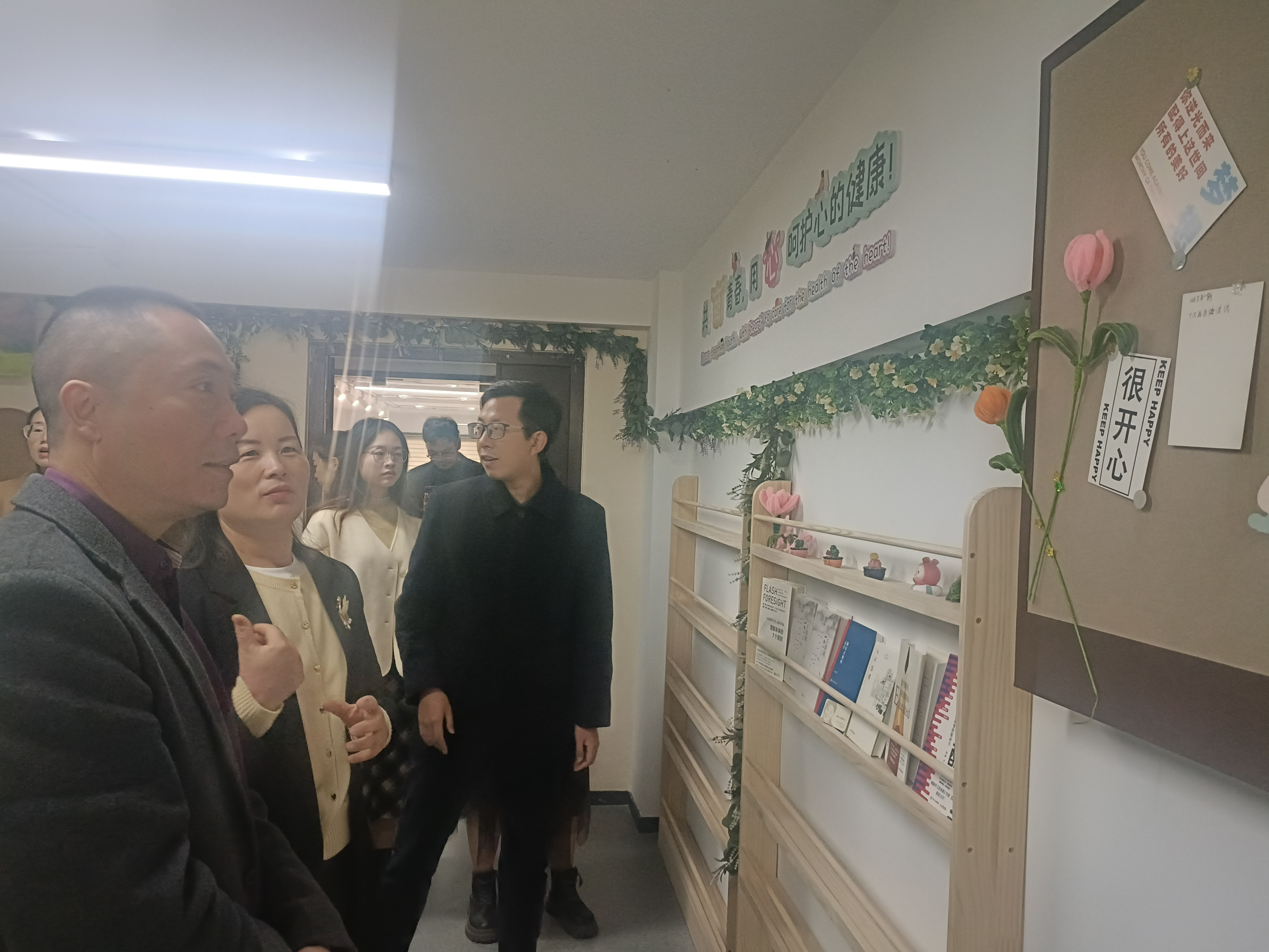 在韩雯琛的带领下,李孝明一行人参观我院“清风长廊”、共“商”青春心理工作室、共“商”未来生涯工作室、学生自习室及党员之家。