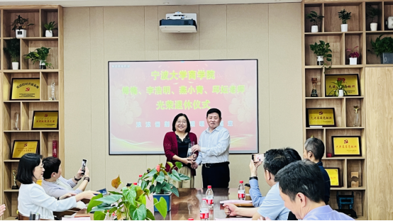 接着,金祥荣院长为四位老师颁发了荣休纪念奖杯;韩雯琛副书记、陈涛副院长为四位老师送上荣休纪念礼物;分工会主席朱一鸿为四位老师送上祝福鲜花。