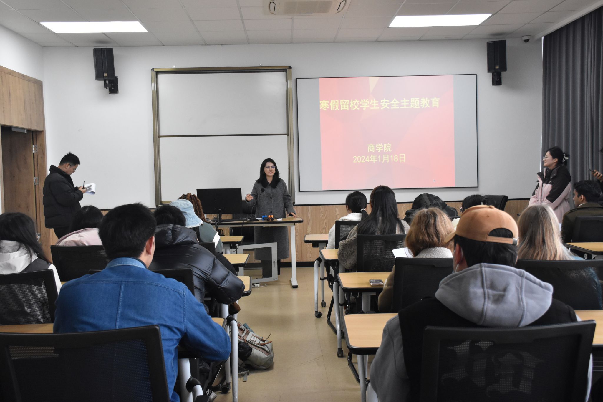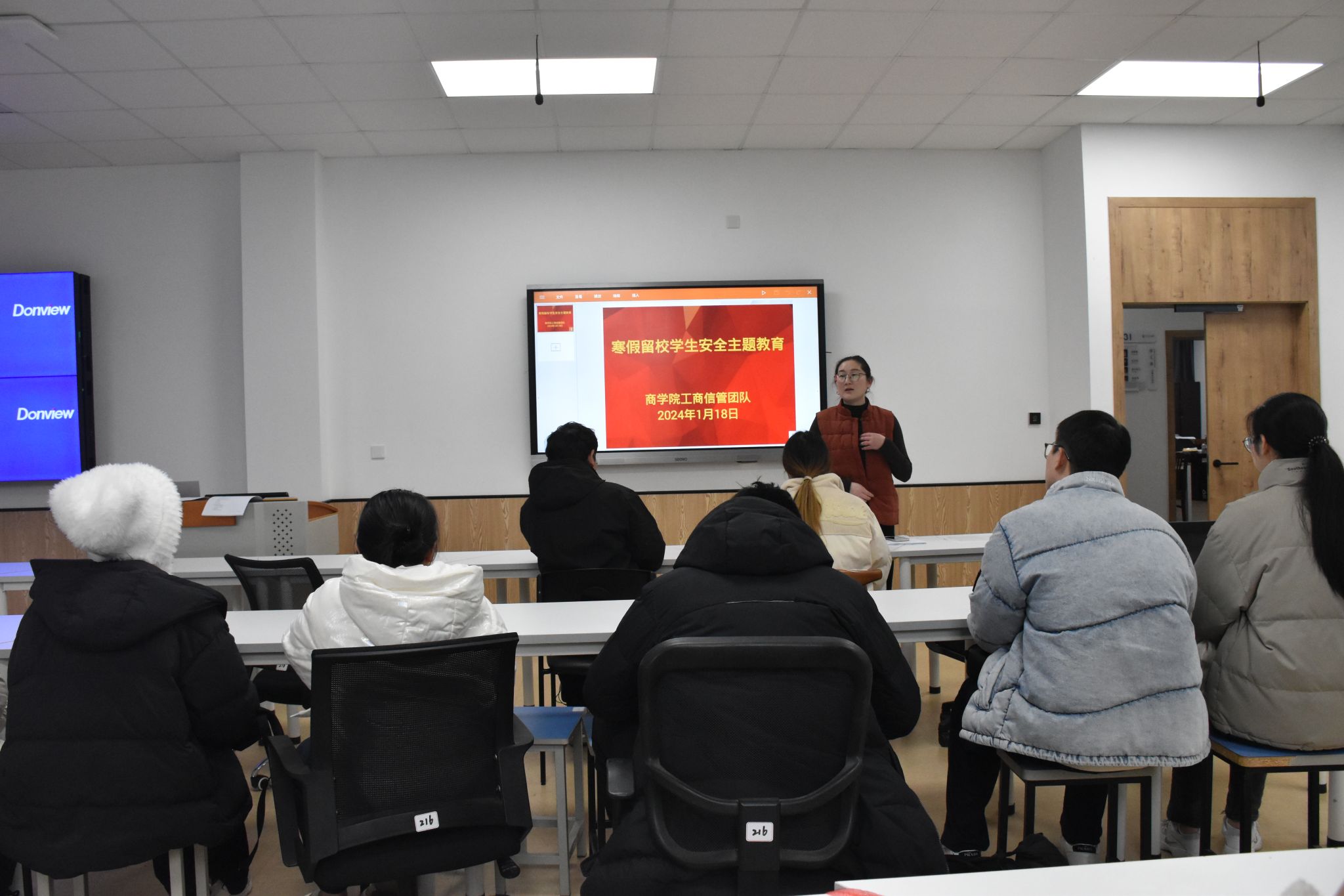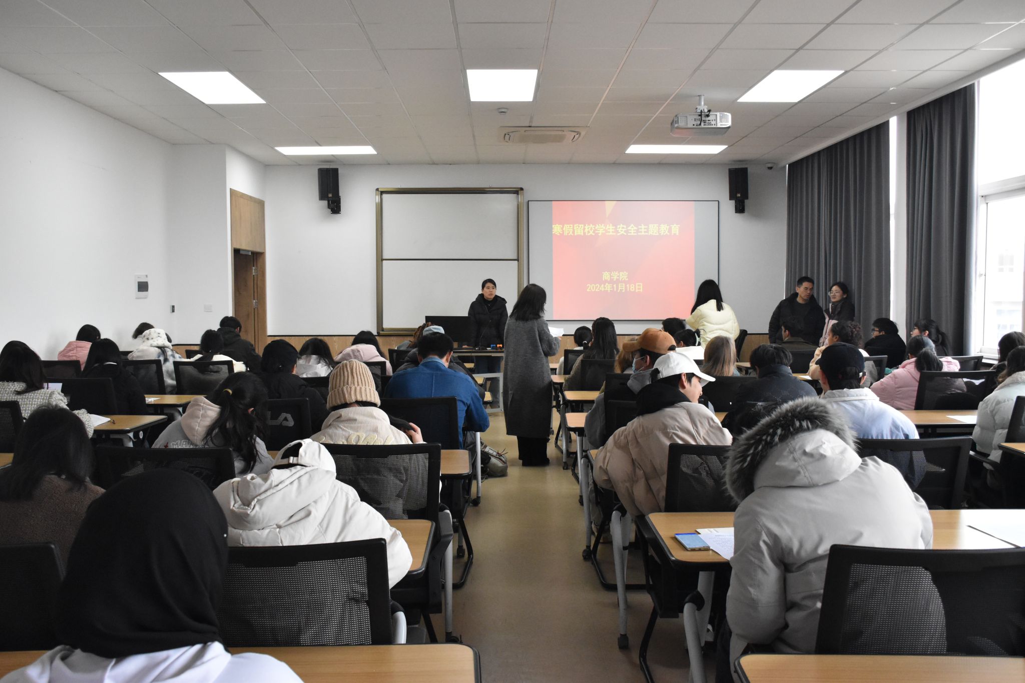 为加强寒假留校学生管理工作,提高学生留校期间的安全意识,1月18日下午,我院在学院523教室和216教室召开寒假留校学生安全教育会议,学院辅导员和百余名寒假留校学生参加。