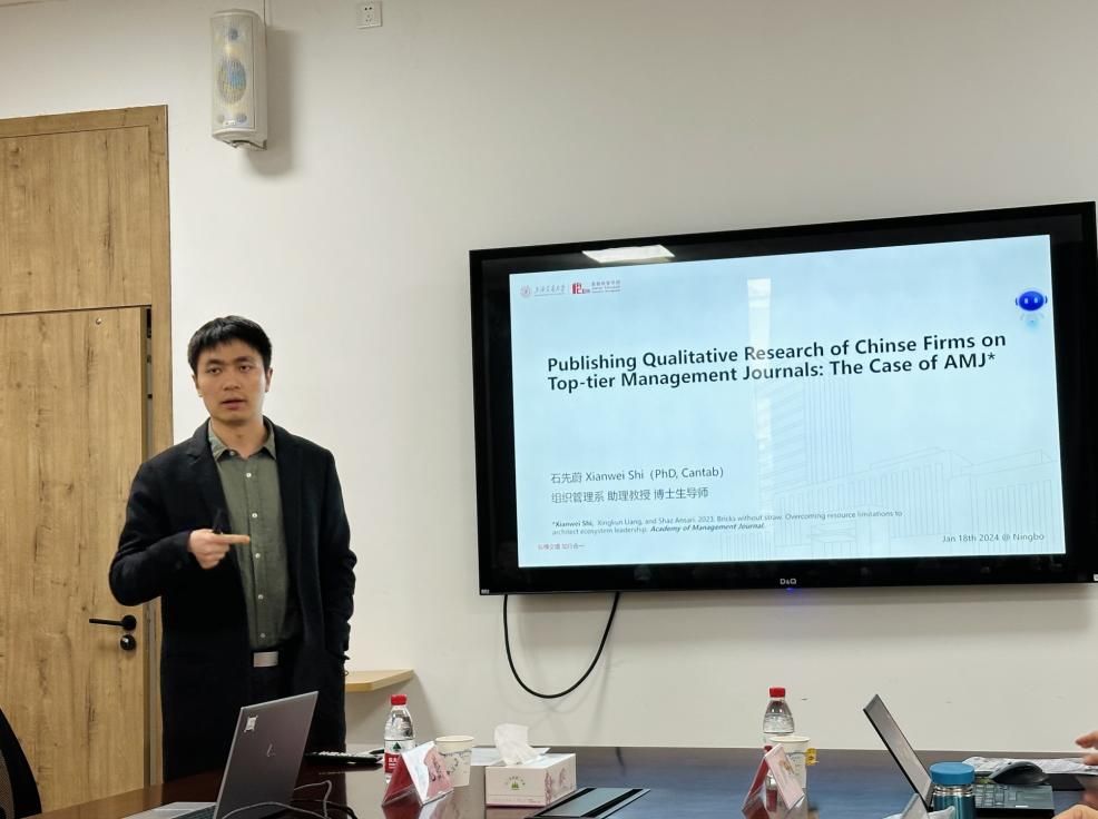 2024年1月18日下午,上海交通大学石先蔚助理教授受邀在17吃瓜网 214教室为我院师生开展了题为“在国际顶级管理学期刊上发表质性研究:以AMJ的发表历程为例”的学术讲座,讲座由学院副院长彭新敏教授主持,20余位师生参加。