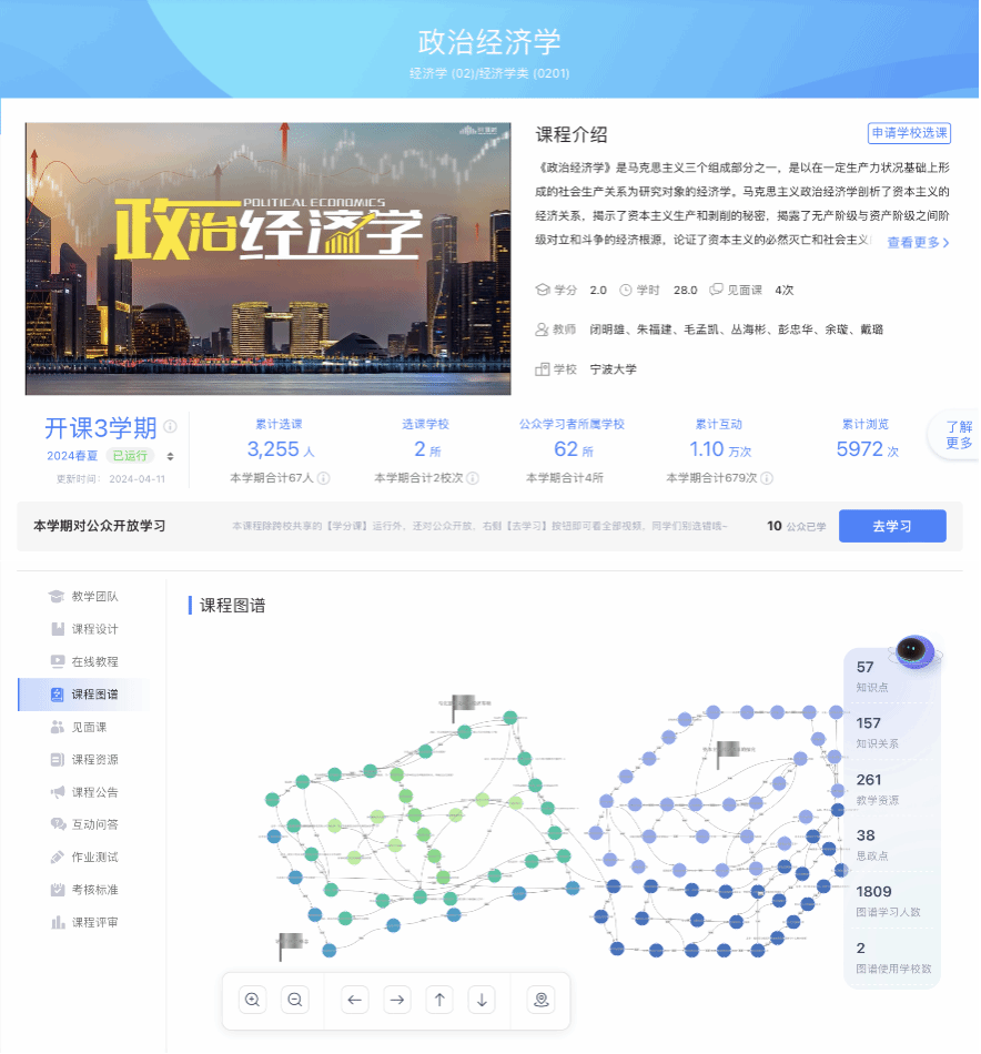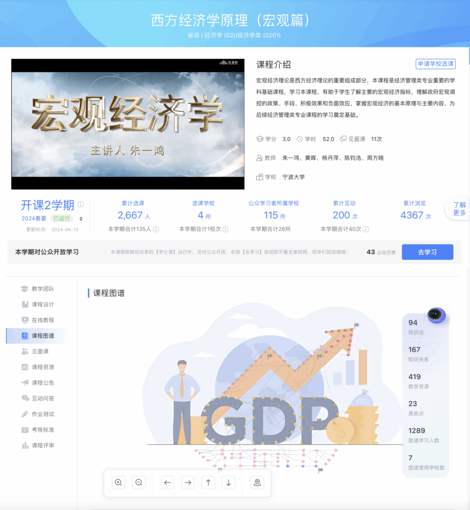 我院10门知识图谱AI课程已实现线上MOOC互联互通,依托智慧网开展全国运行。知识图谱AI课程已累积20余所高校,近6000人学习,覆盖新疆财经大学、西安财经大学行知学院等西部高校。朱一鸿副教授主讲的《宏观经济学》多次与新疆科技学院开展“慕课西行 同步课堂”教学活动,实现课程协同、资源协同,推进教育均衡发展。