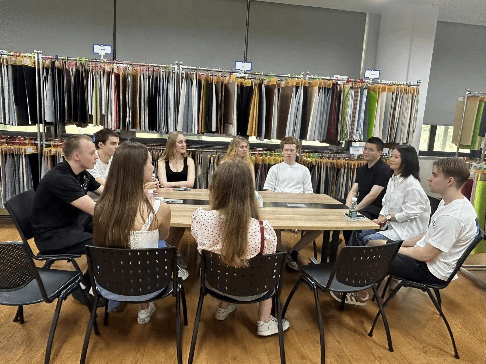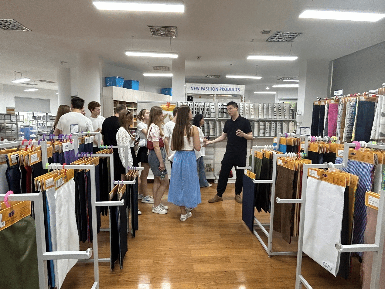 接着,集团工作人员带领师生们前往公司的样品间,详细介绍了公司的主营产品。同学们亲身体验了各种服装辅料、刺绣花边、线类、带类、钮扣类和拉链类产品,深入了解了公司核心产品的优势和特点。
