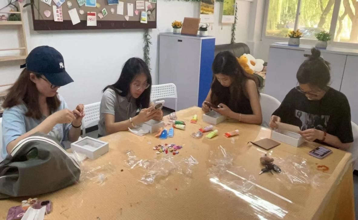 同学们手执奶油胶枪,挑选着各式各样的装饰素材,将一个个简洁的相框基底转变为充满个性和创意的装饰品。随着时间的流逝,一个个色彩鲜艳、设计巧妙的奶油胶相框在同学们的巧手和无限的创意中逐渐完成。有的同学以六月的明亮色调和夏日元素为主题,打造出洋溢着夏日风情的相框;有的则以毕业帽、校园建筑或书本的图案为特色,寄托对校园时光的怀念与致敬;还有的同学发挥自己的想象力,用星星、心形或波浪等图案装饰相框边缘,创造出富有动感和层次的视觉效果……每一个相框都是一个等待填充故事的画布,准备留下记忆的瞬间。
