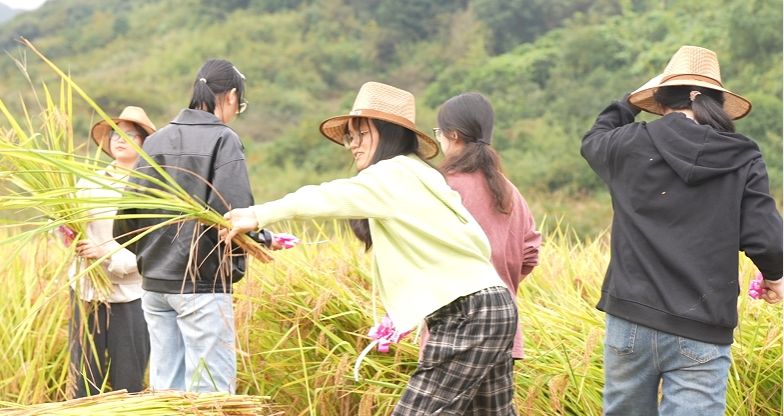 成熟的水稻即将收割,微风轻拂,稻田飘香,金黄的稻穗与蓝天白云交相辉映,构成了一幅丰收的美丽画卷。伴随着收获的喜悦,我院的劳动教育课堂也在陶坑村缓缓拉开序幕。11月16日,我院师生来到了宁波市奉化区裘村镇陶坑村,参与了“侨义助农 共庆丰收——陶坑共富新米节”活动,亲身体验了水稻收割的全过程。活动特别邀请了当地富有经验的农户对劳动教育课堂的实施进行指导。