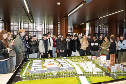 图 2.讲解员向留学生介绍理想城布局理念