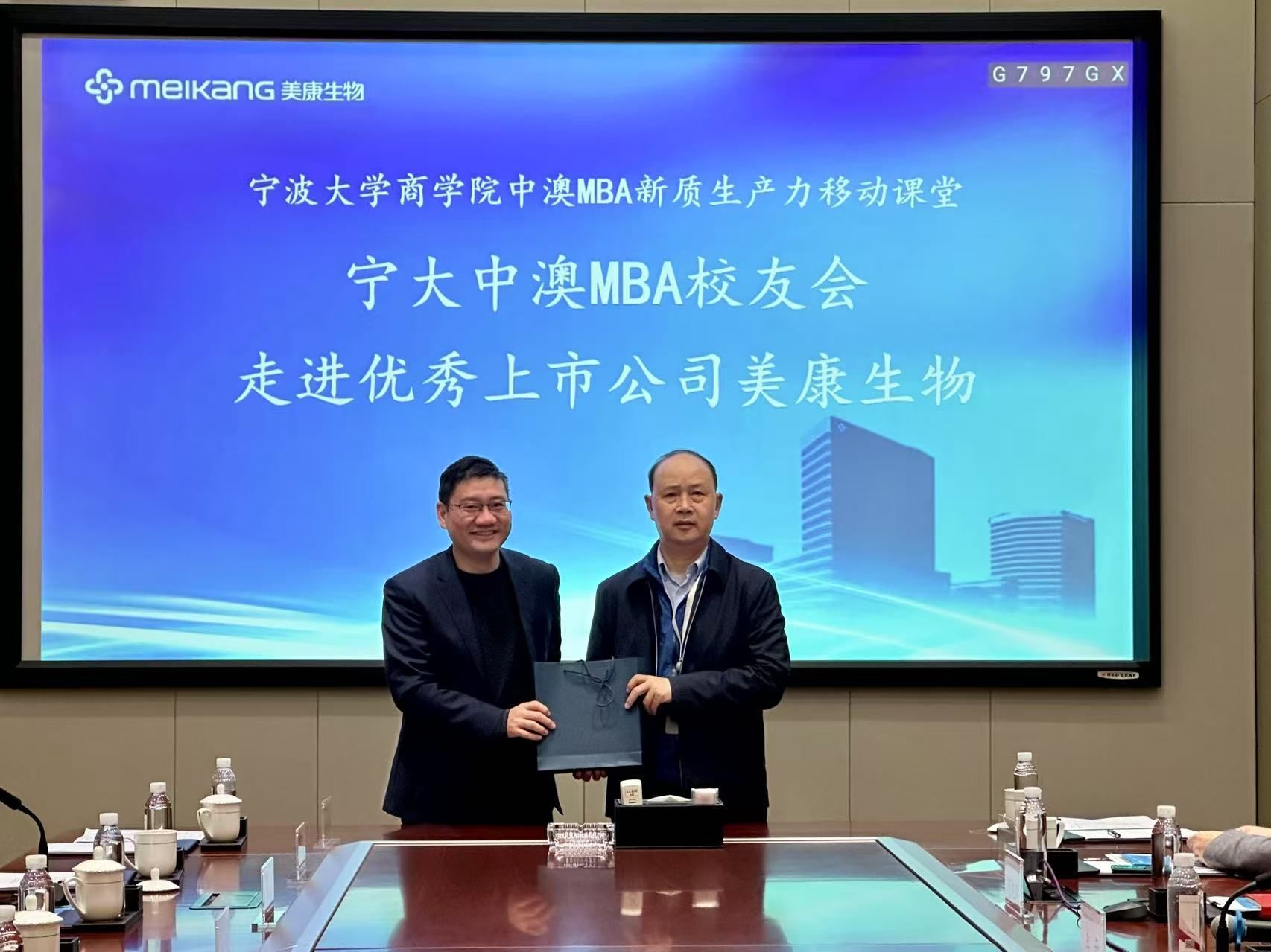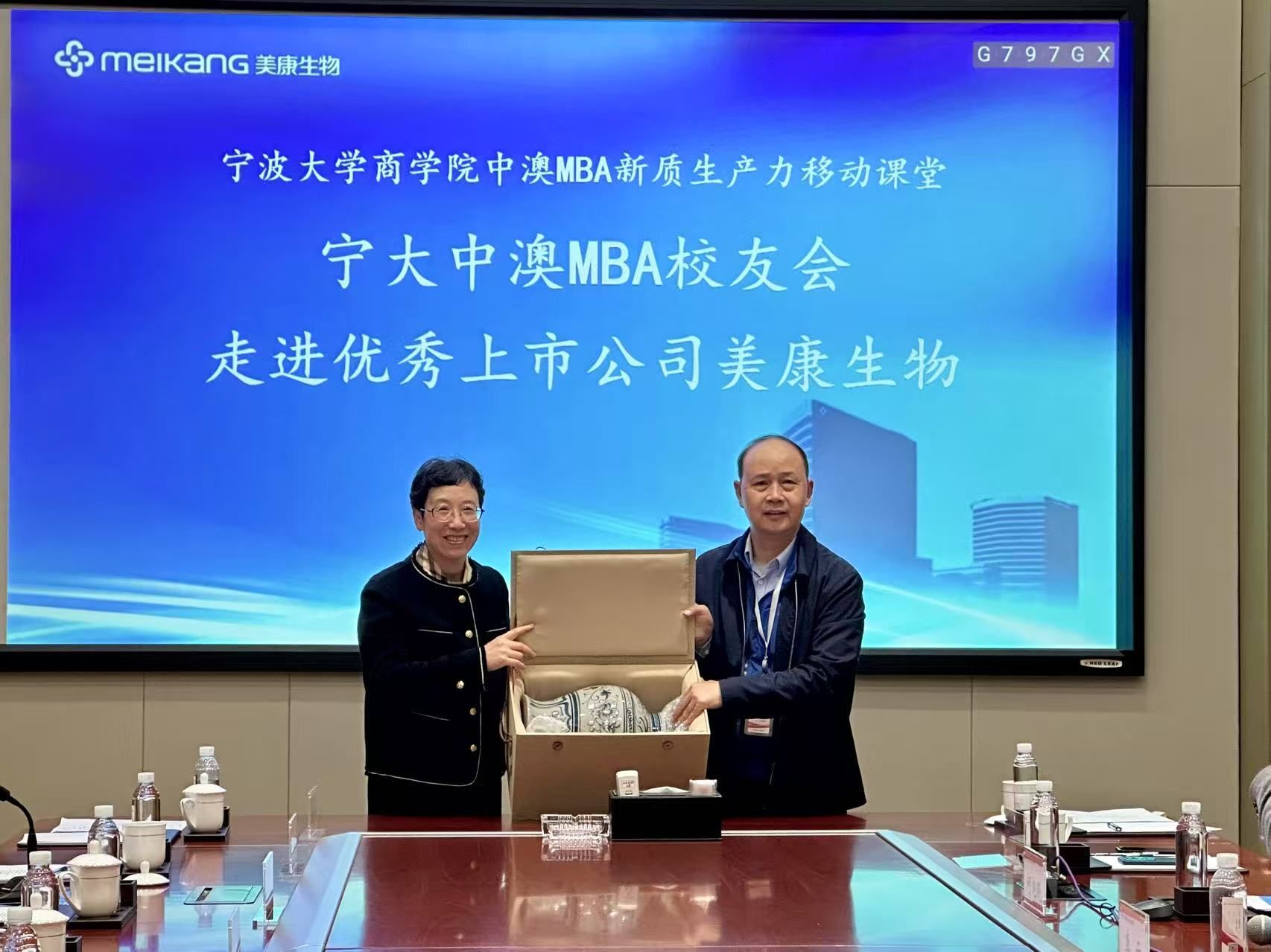 交流结束后,彭新敏副院长代表17吃瓜网 ,邱妘教授代表17吃瓜网 中澳MBA校友会分别向美康生物送上了精心准备的感谢礼品。全体参会人员在公司一楼大厅内进行了合影留念,为此次活动留下了珍贵的记忆。