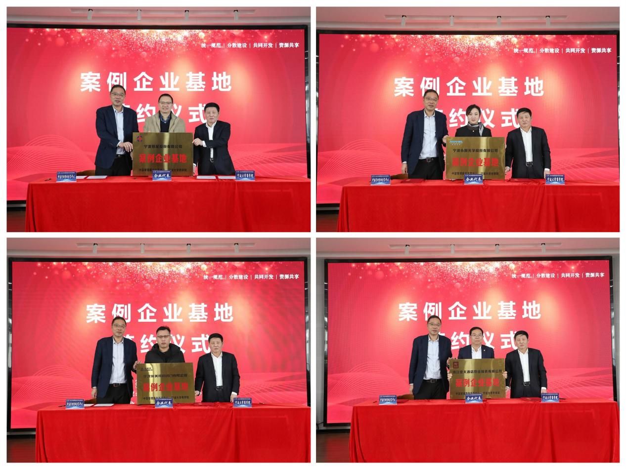 随后进行了案例企业基地签约仪式。叶鑫和金祥荣分别与宁波慈星股份有限公司(上市公司)、宁波永新光学股份有限公司(上市公司)、宁波埃美柯铜阀门有限公司、浙江亚太酒店物业服务有限公司四家企业代表签约并授牌。