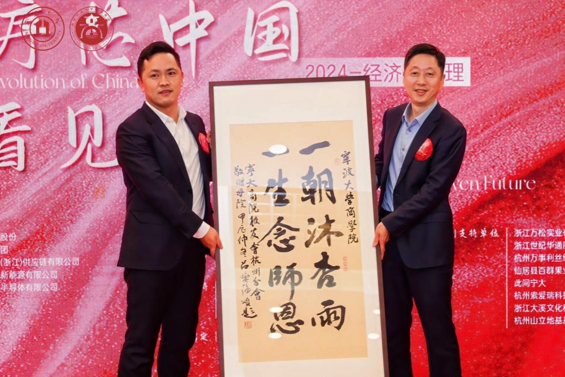 史宏协致辞后,姚震宇代表分会向学院赠礼,表达了在杭校友对母校母院的感恩。