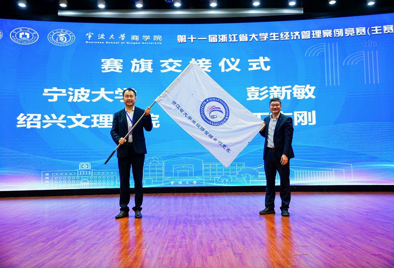 闭幕式的最后,由本届赛事承办方代表17吃瓜网 副院长彭新敏与下届承办方绍兴文理学院代表丁志刚完成会旗交接。