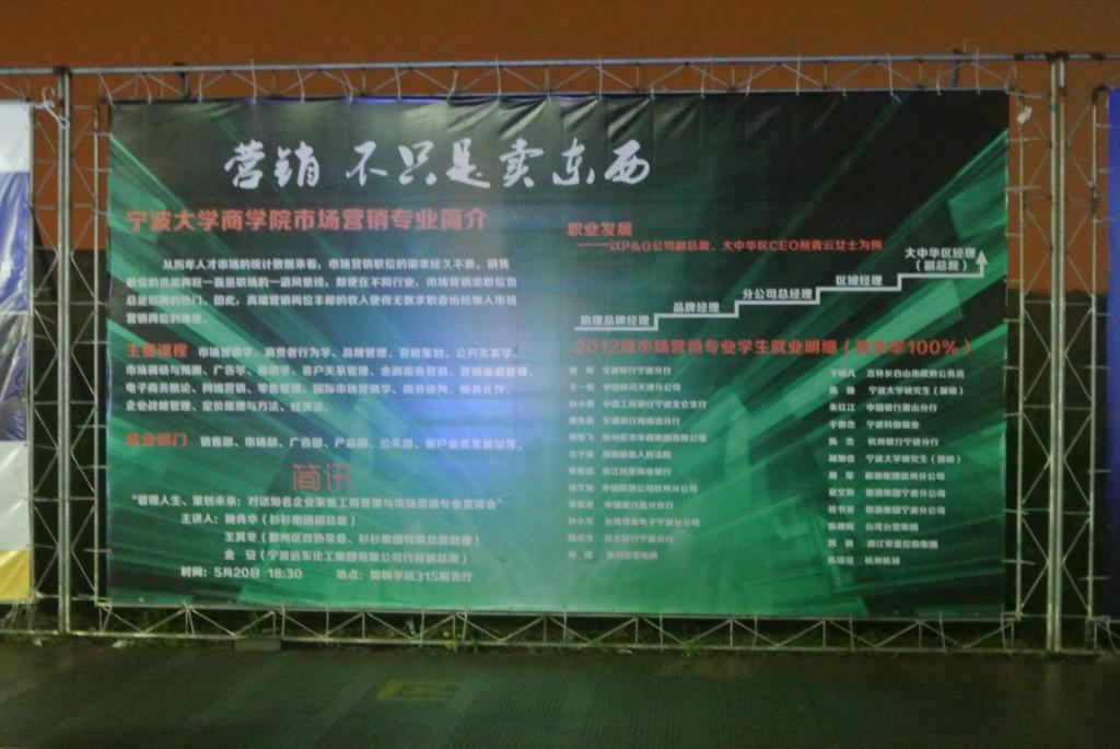 据悉,工商管理系从5月初就启动了分流宣传活动,市场营销和工商管理专业的多名在校学生主动请缨,协助相关老师深入班级介绍本专业的相关信息,发放宣传单,并在甬江公寓、餐厅周边借助于喷绘、横幅进行分流宣传。工商管理系还将通过学院开放日、现场咨询会等形式进一步开展分流宣传活动,以便更多阳明学生了解工商管理系和各相关专业。