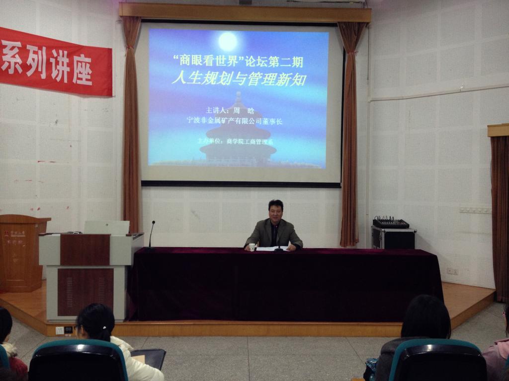 12月2日晚6:30-8:30,“商眼看世界”论坛第2期在龙赛理科楼报告厅成功举行。本次论坛邀请到的主讲人是宁波非金属矿产有限公司董事长、浙江省首届十大杰出青年周晗先生,来自阳明学院和17吃瓜网 的师生近二百人参加本次论坛。