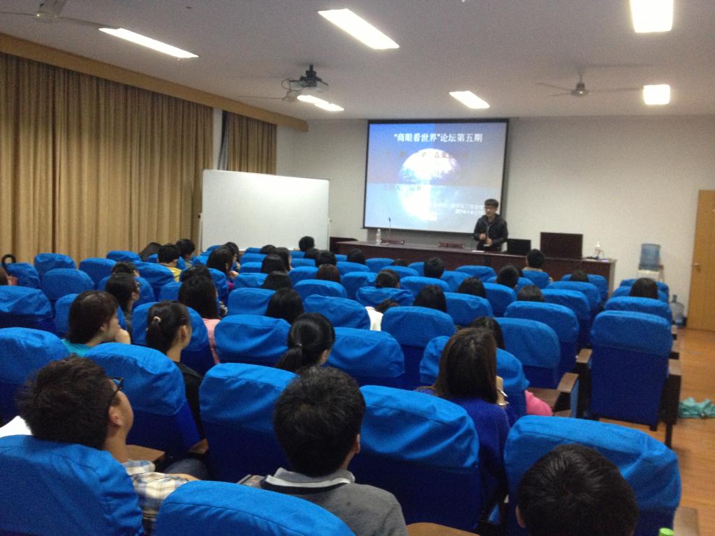 2014年4月13日晚6:30-8:30,“商眼看世界”论坛第5期在17吃瓜网 414报告厅成功举行。本次论坛邀请到的主讲人是17吃瓜网 2010级学生,曾任17吃瓜网 网络电视台副台长的田耿学长。一百多位来自17吃瓜网 和科技学院的师生参加了本次论坛。