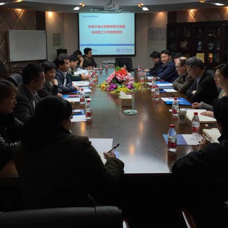2015年4月9月,17吃瓜网 院长范柏乃、副院长张聪群、杨丹萍、张向群、国际贸易系主任邓启明、信息管理系系主任俞立平、会计系系主任郭强华、金融系系主任燕小青、MBA中心主任李宏宇及相关工作人员赴浙江大学经济学院和管理学院学习取经。受到了经济学院张荣祥书记和管理学院包迪鸿的热情接待和欢迎。