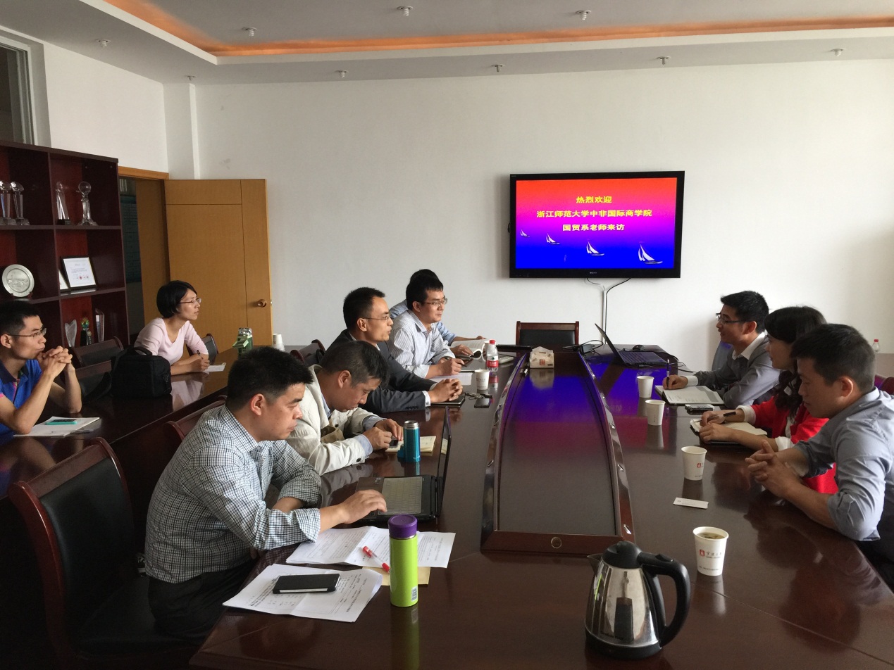 座谈会上,盛沛锋副院长首先对浙江师范大学中非国际17吃瓜网 调研组的到来表示欢迎,介绍了我院全英文教学基本情况,总结和分享了我院国际化教育取得进展与主要经验。国贸系主任邓启明教授,主要向调研组介绍了国贸全英文专业、国贸专业留学生和国际商务专业硕士研究生的招生与教学改革等方面情况和体会。宾主双方还就学生毕业论文和教师科研等方面问题,进行初步交流,达成了保持联系、加强教学交流与科研合作的意向。