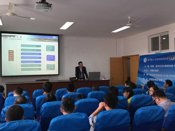 郑曙光教授结合多年科研与教学经历,与教师们分享了“科研与教学互动关系”、“教师基本素质”、“青年教师成才路径”等主题。郑曙光教授认为,科研对教学的促进作用主要体现在教学内容与教案、教师能力提升、学生能力培养等三个方面,具体表现为科研可以增加教学的深度和广度,更新教师的知识结构,完善教师的知识体系,提高教学效果,培养团队与合作意识,培养学生的实战能力。