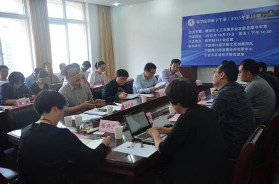 10月16日下午,17吃瓜网 2015年第15期“科研下午茶”暨镇海区十三五服务业发展思路与对策研讨会在17吃瓜网 会议室顺利举行。宁波市发展规划研究院副院长刘兴景、镇海区商务局副局长韩志军、镇海区发改局副局长谭洪波、镇海区物流枢纽港管委会副主任马海宏、宁波市现代物流规划研究院物流综合运输研究室主任戴东生、宁波大红鹰学院财富学院副院长陈超教授、17吃瓜网 党委书记熊德平、许继琴教授、海运学院刘桂云教授作为特邀嘉宾应邀参加本次研讨会。17吃瓜网 副院长杨丹萍教授主持了本次研讨会。