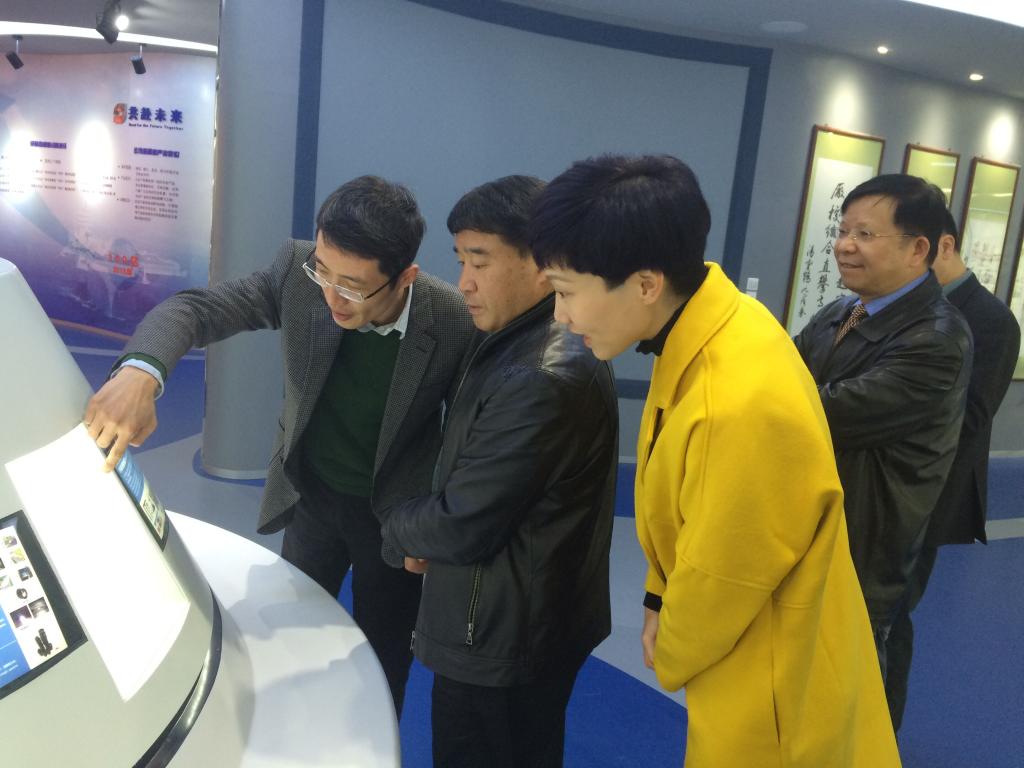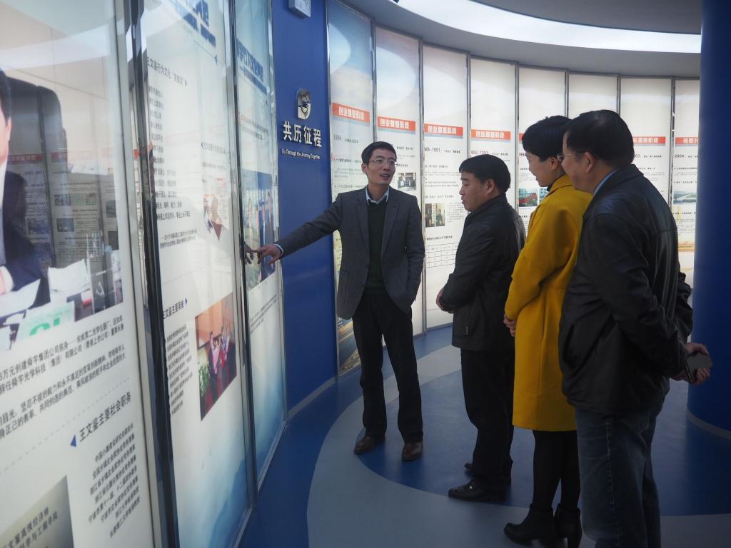 在孙泱总裁的陪同下,范院长一行兴致勃勃地来到企业展厅参观。孙泱校友向母院领导介绍了企业光学、光电和仪器事业以及发展历程,回顾了与母校的相关合作情况。